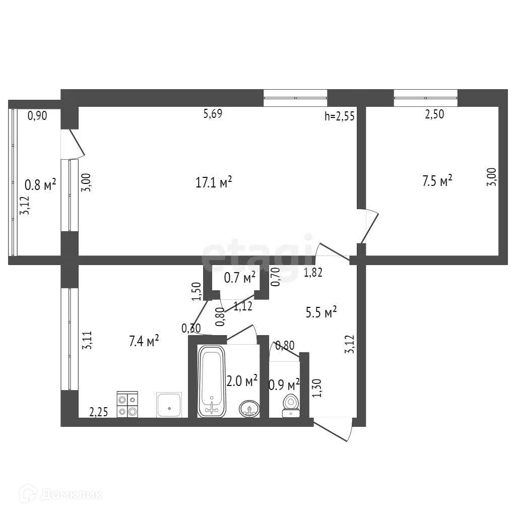 Общая площадь 42.5 м2