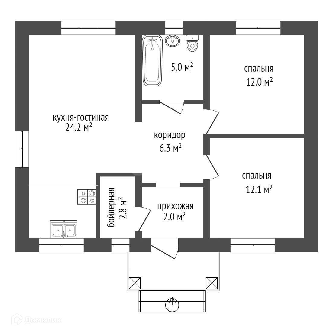 Предлагается к продаже дом, общей площадью 64,4 м2, формат евро-трешка или 2 плюс, просторная кухня-гостиная, и две полноценные спальни.