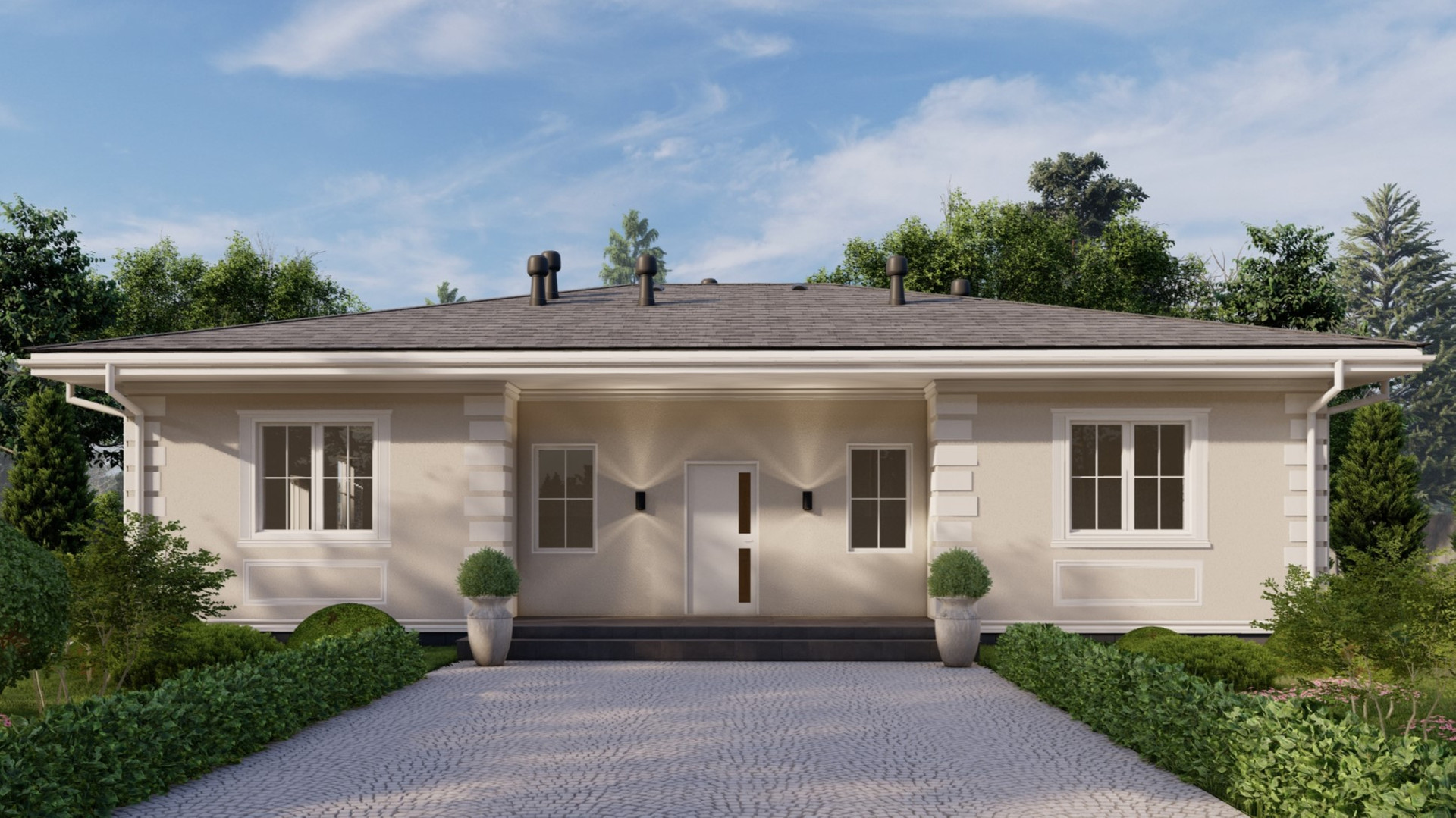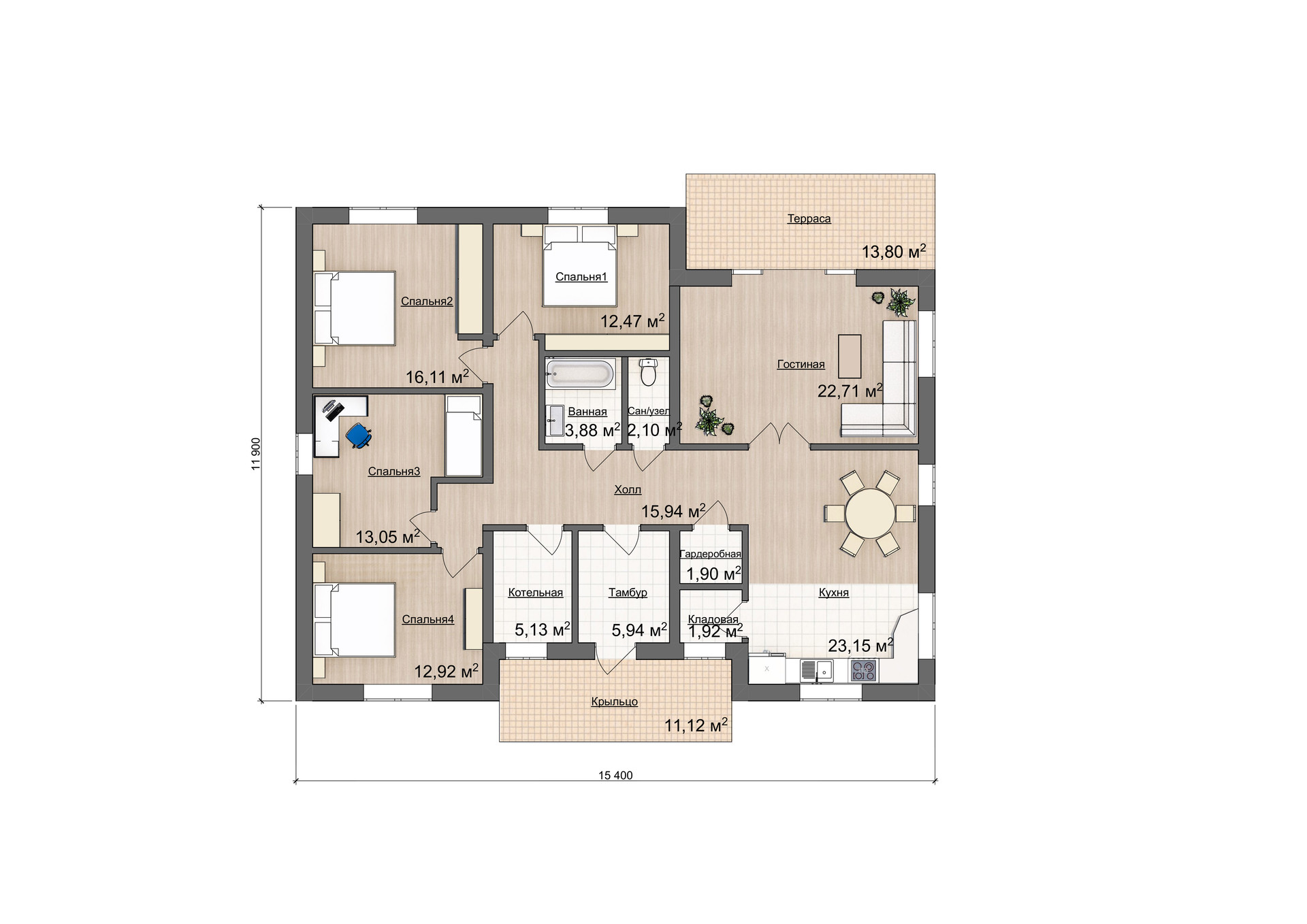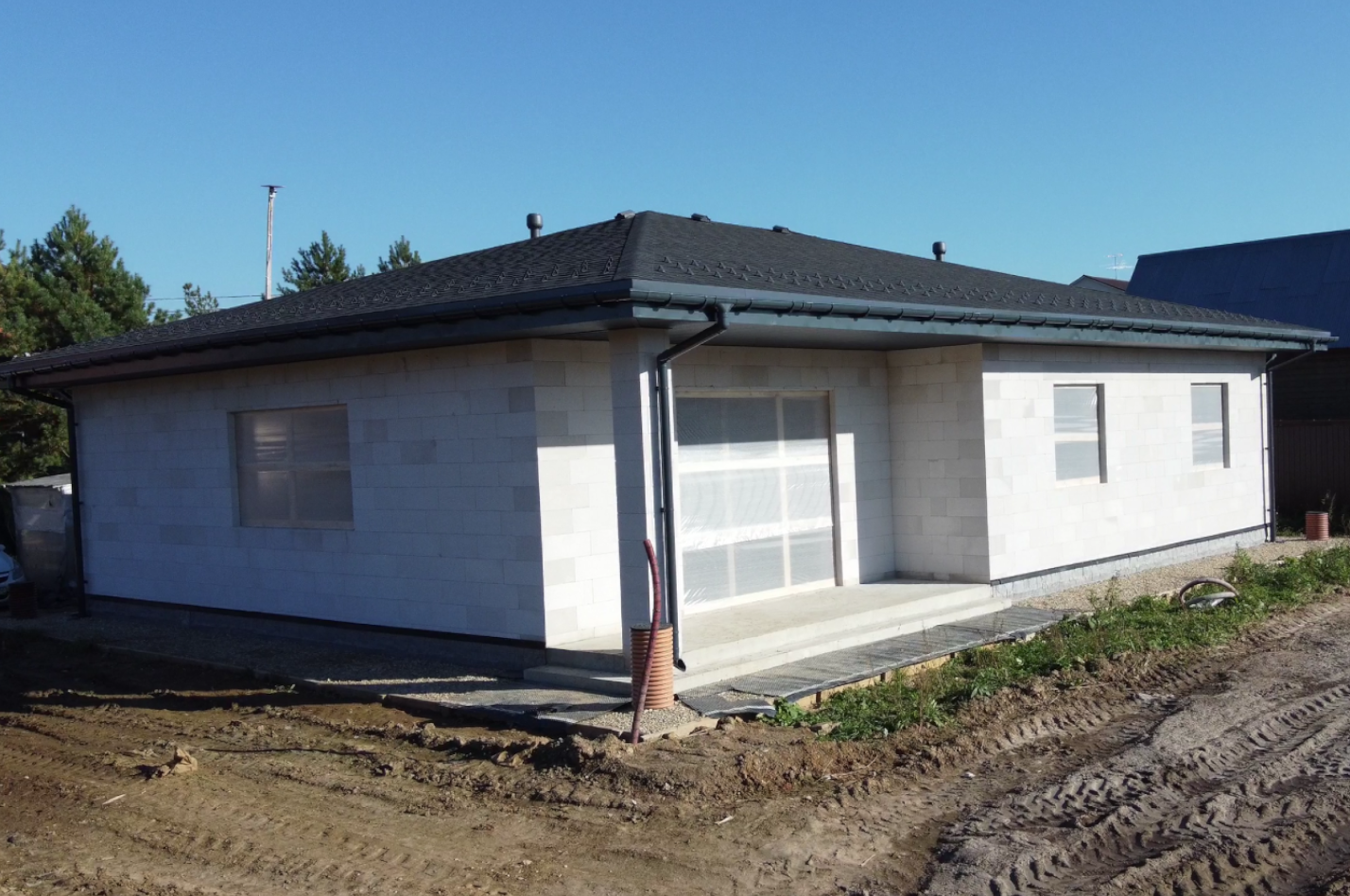 Представляем вашему вниманию одноэтажный дом 11,9х15,4 по проекту Саввино, общей площадью 183 кв м с живой, меняющейся панировкой. Это полностью отработанный проект, который постоянно совершенствуется и масштабируется. Дом построен из газобетонных блоков на монолитном плитном фундаменте. Он имеет внутреннюю площадь 140 кв м и разместил в себе все необходимые для комфортной жизни помещения: кухня, гостиная, 4 жилых спальни, ванная, туалет, гардеробная, кладовая, котельная и прихожая. Все продумано до мелочей. Более того, вы всегда сможете адаптировать дом под себя, увеличить площадь или изменить планировку.