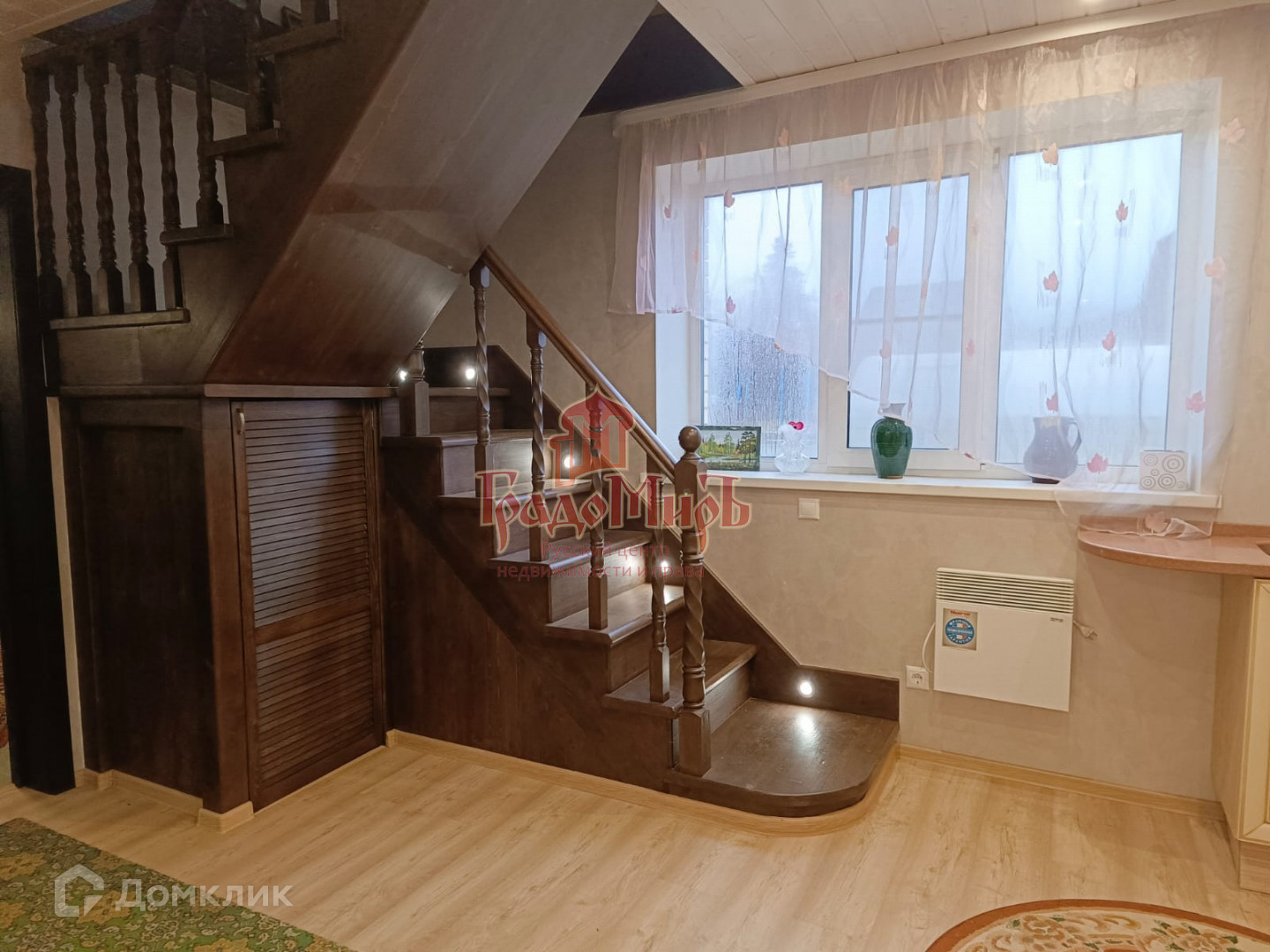Между этажами широкая комфортная лестница с дополнительной подсветкой. Под лестницей имеется небольшое помещение для хозяйственных нужд.