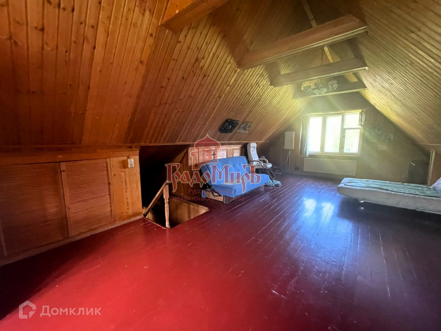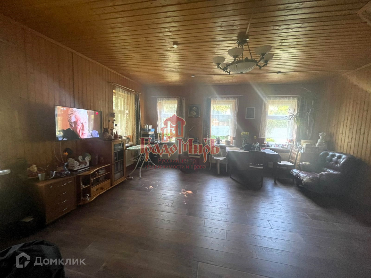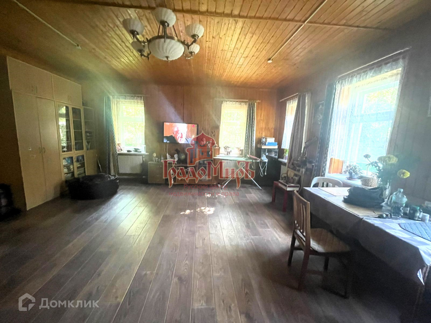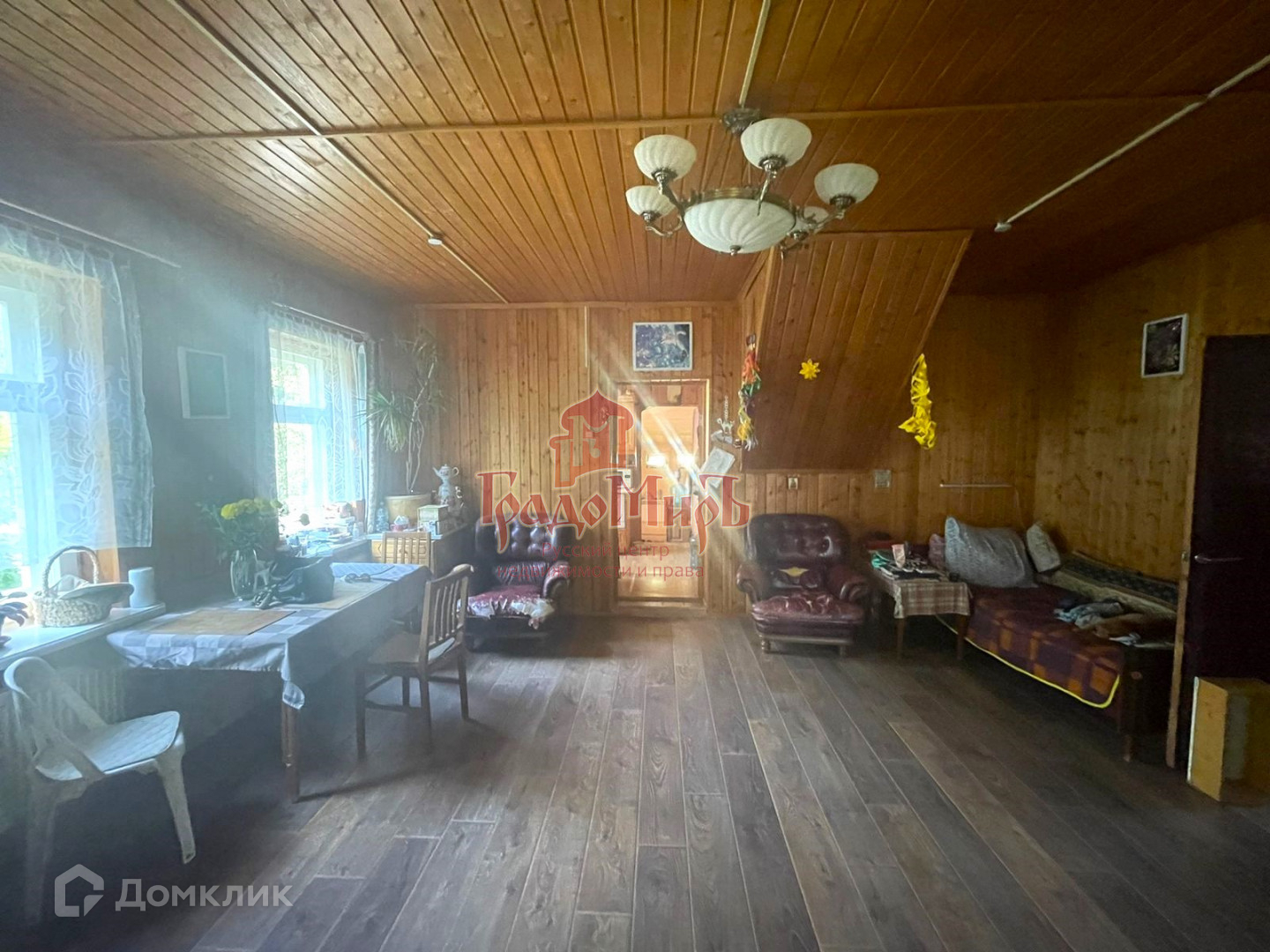 Бревенчатый дом стоит на ленточном фундаменте, общая площадь 120 м2 три комнаты на первом этаже и большая комната во весь дом на мансардном этаже, уютная кухня, дом утеплен полностью в доме, проведено центральное газовое отопление, совмещенный санузел.