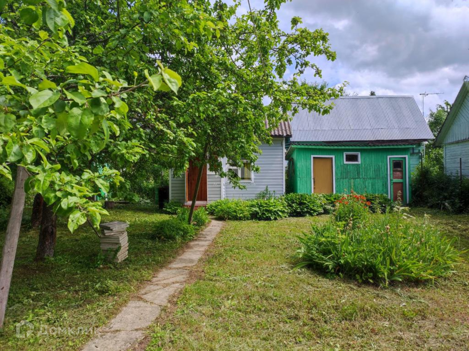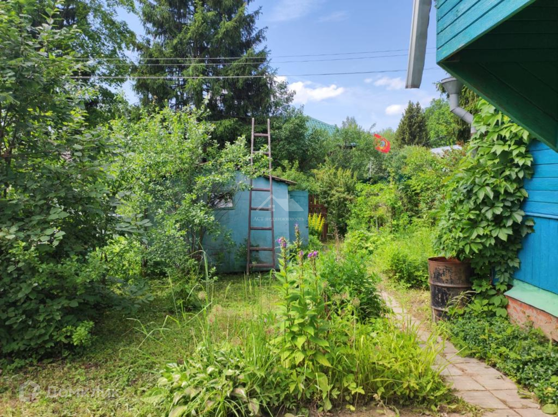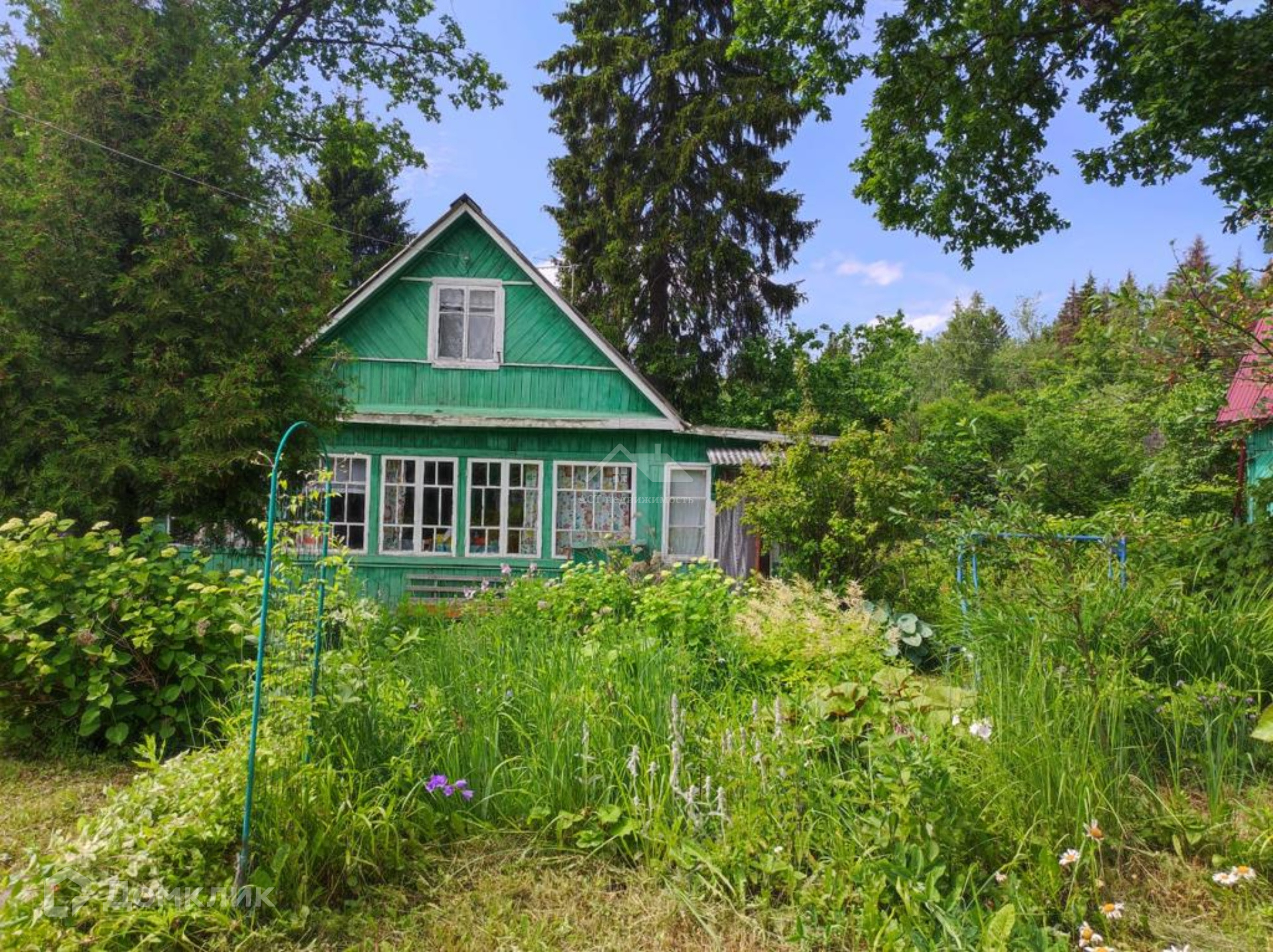 На участке растут лесные и плодовые деревья, много цветов и кустарников.