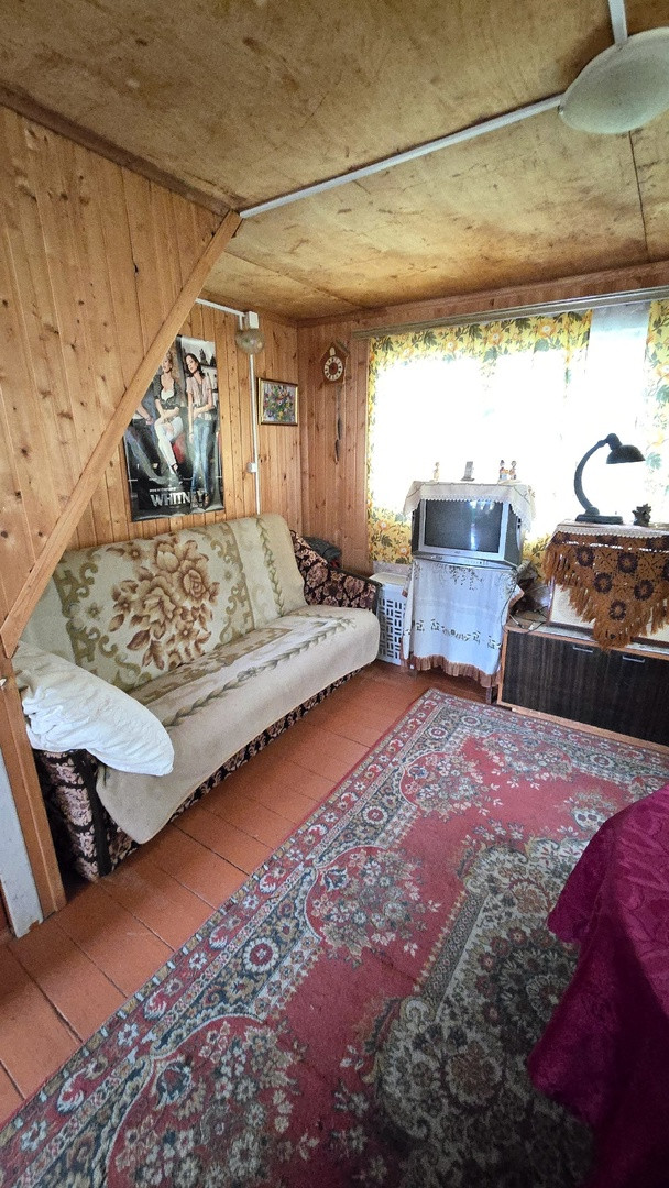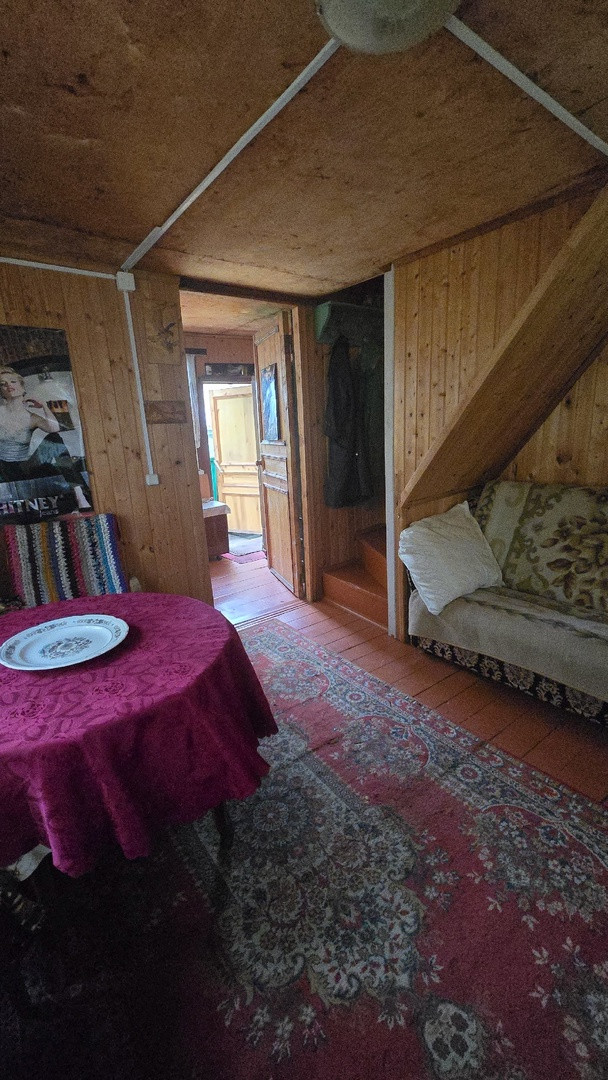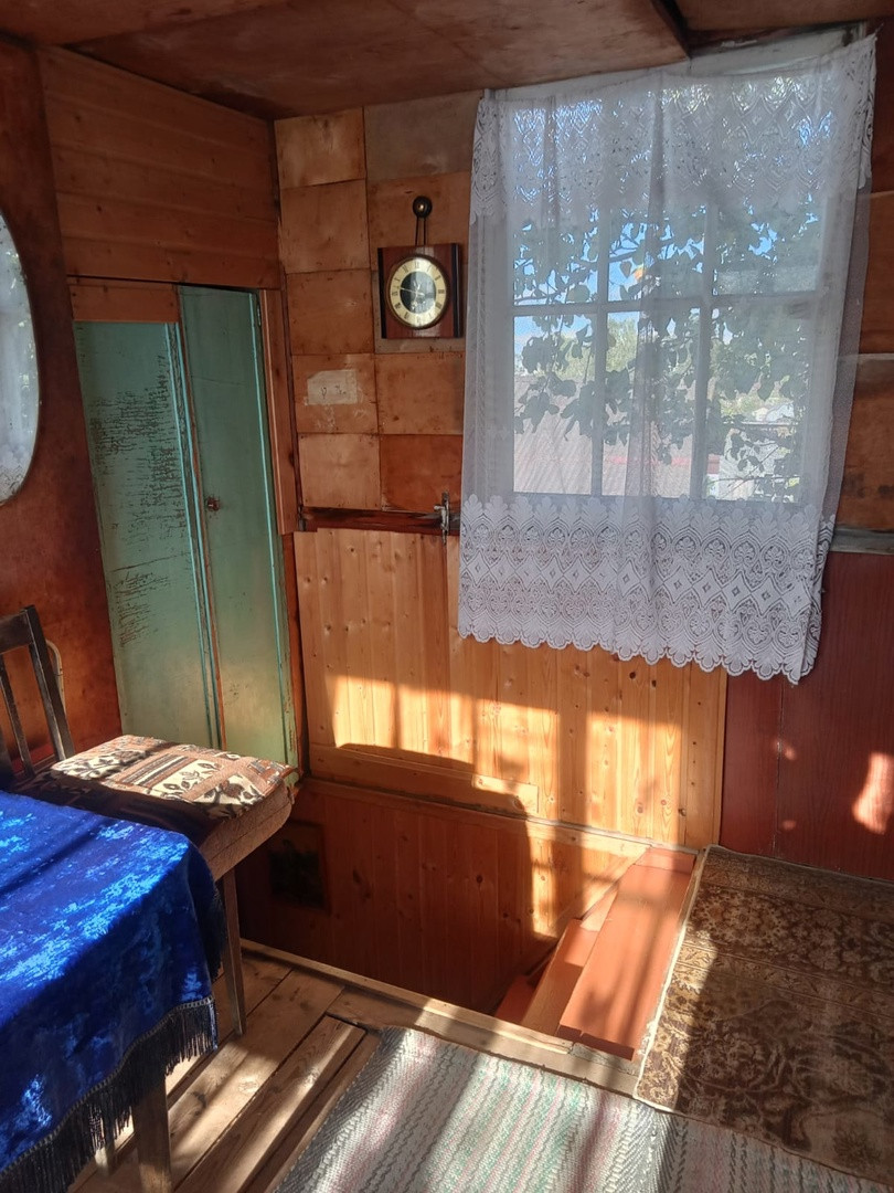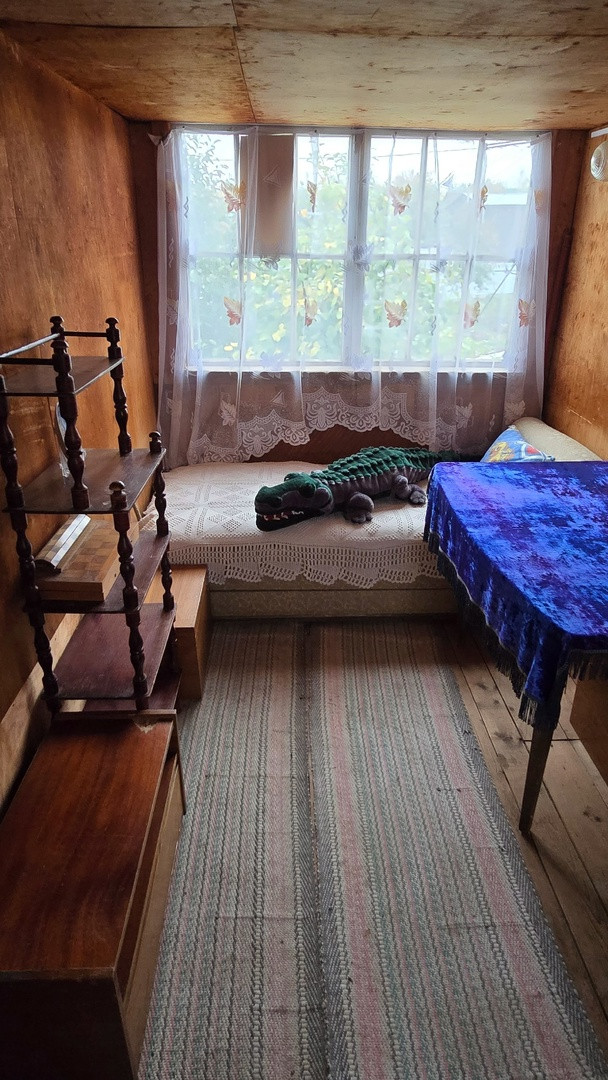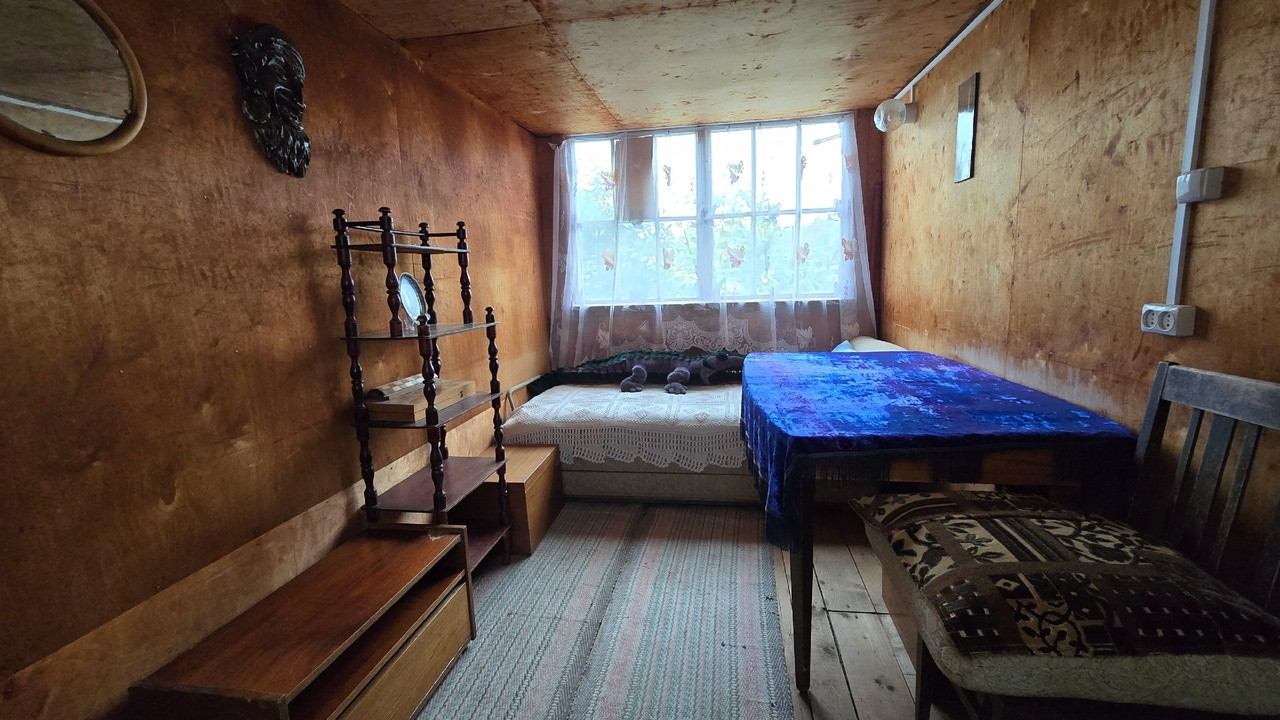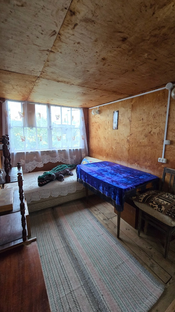 Дачный домик 3,5м*4,5м (не зарегистрирован!) имеет 2 этажа: на первом кухня и гостевая комната, на втором комната отдыха + кладовые. Коммуникации: вода летняя, электричество подведено и распределено по дому, душ и туалет уличные.