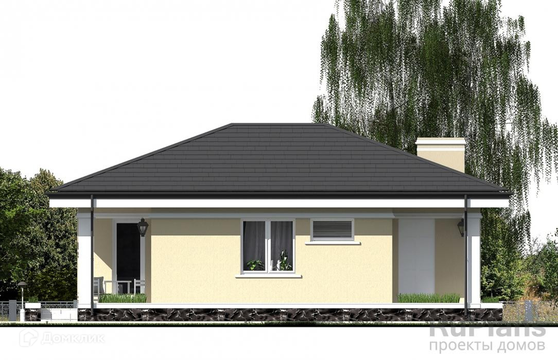 Дом одноэтажный из пеноблоков 300 на свайно-ростверковом фундаменте с утепленной шведской плитой.  Крыша - четырехскатная из металлочерепицы.