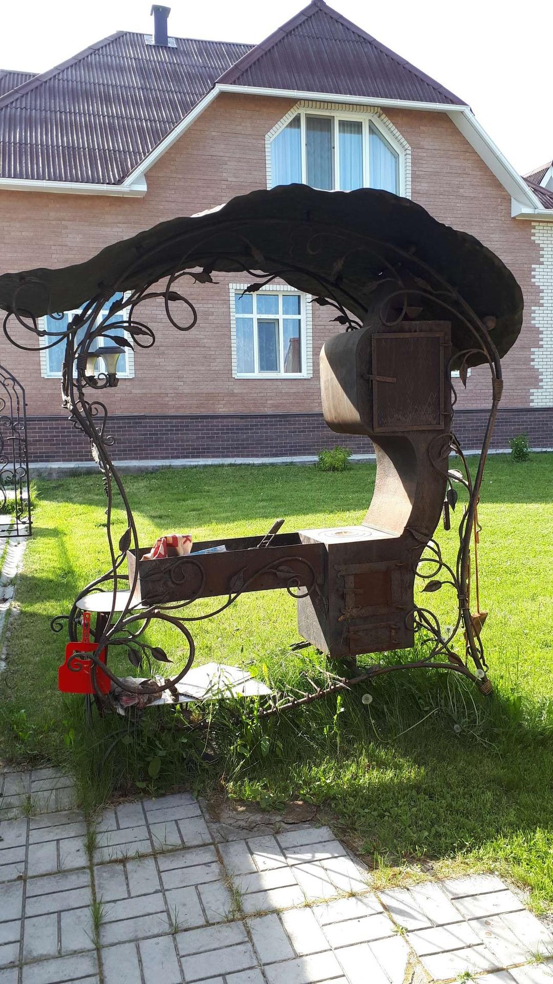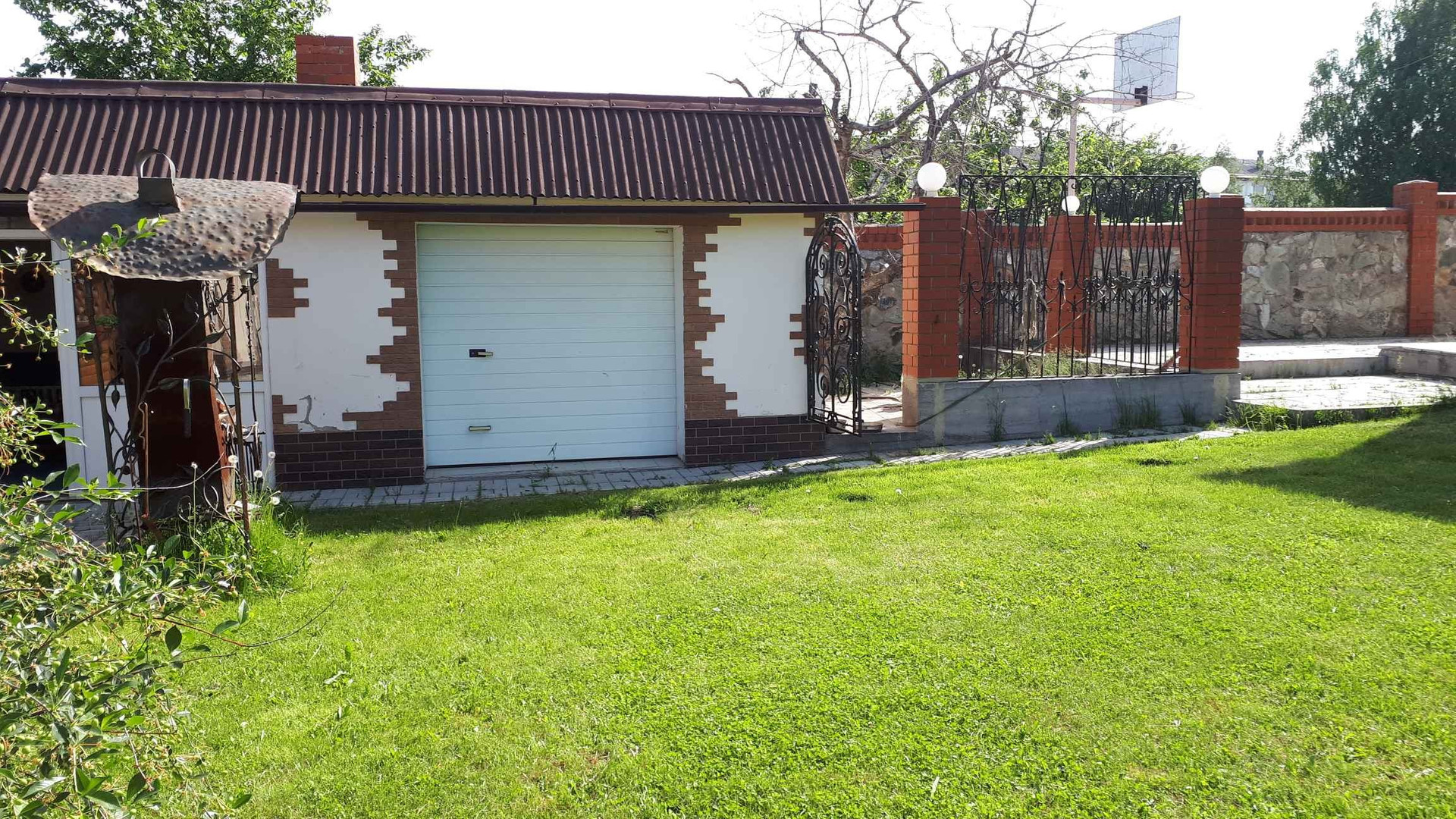 На участке находится баня с бассейном (3×4 м), летняя и зимняя беседка с камином, мастерская, гараж для садовой техники и вольер для собаки.
