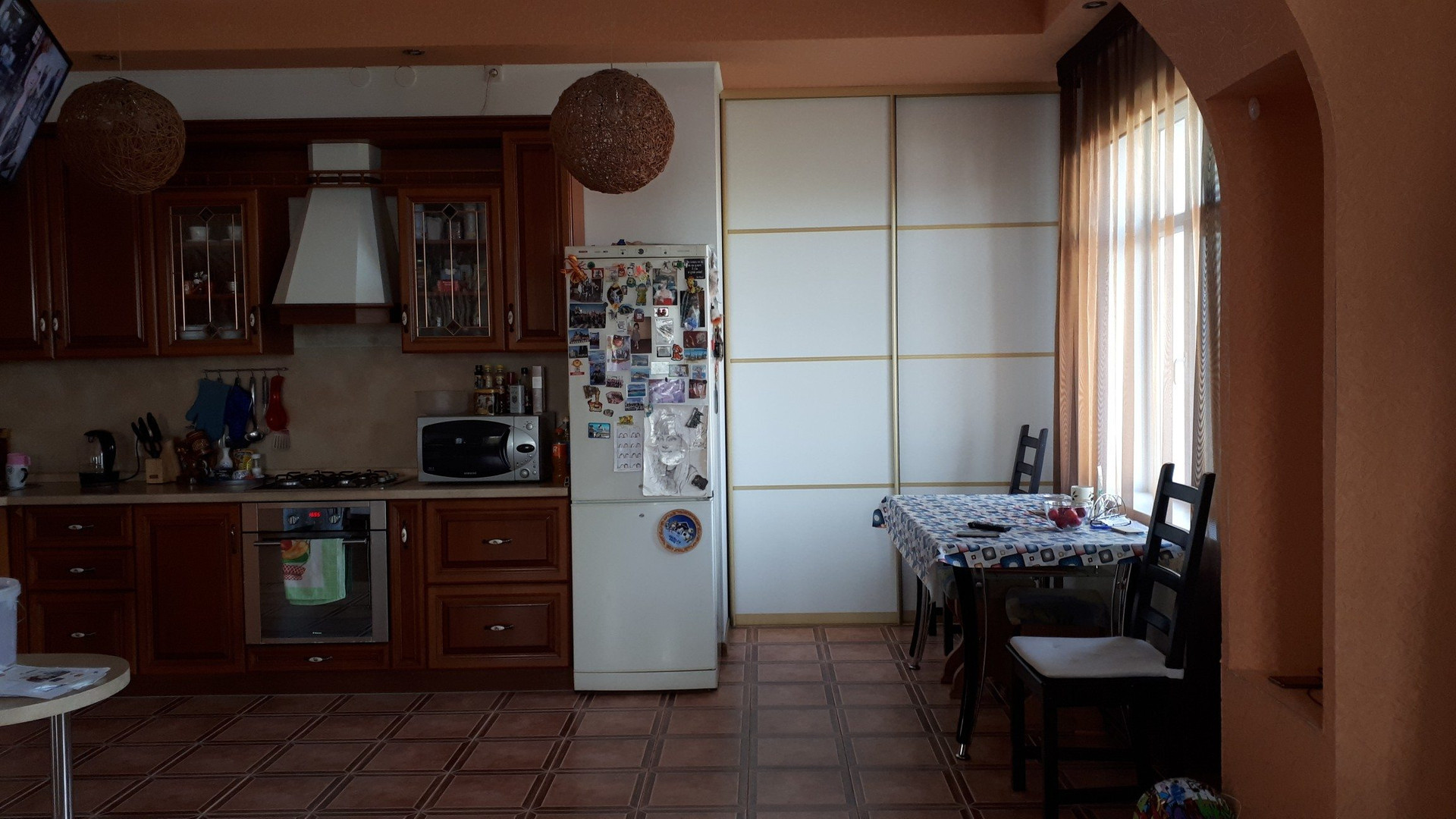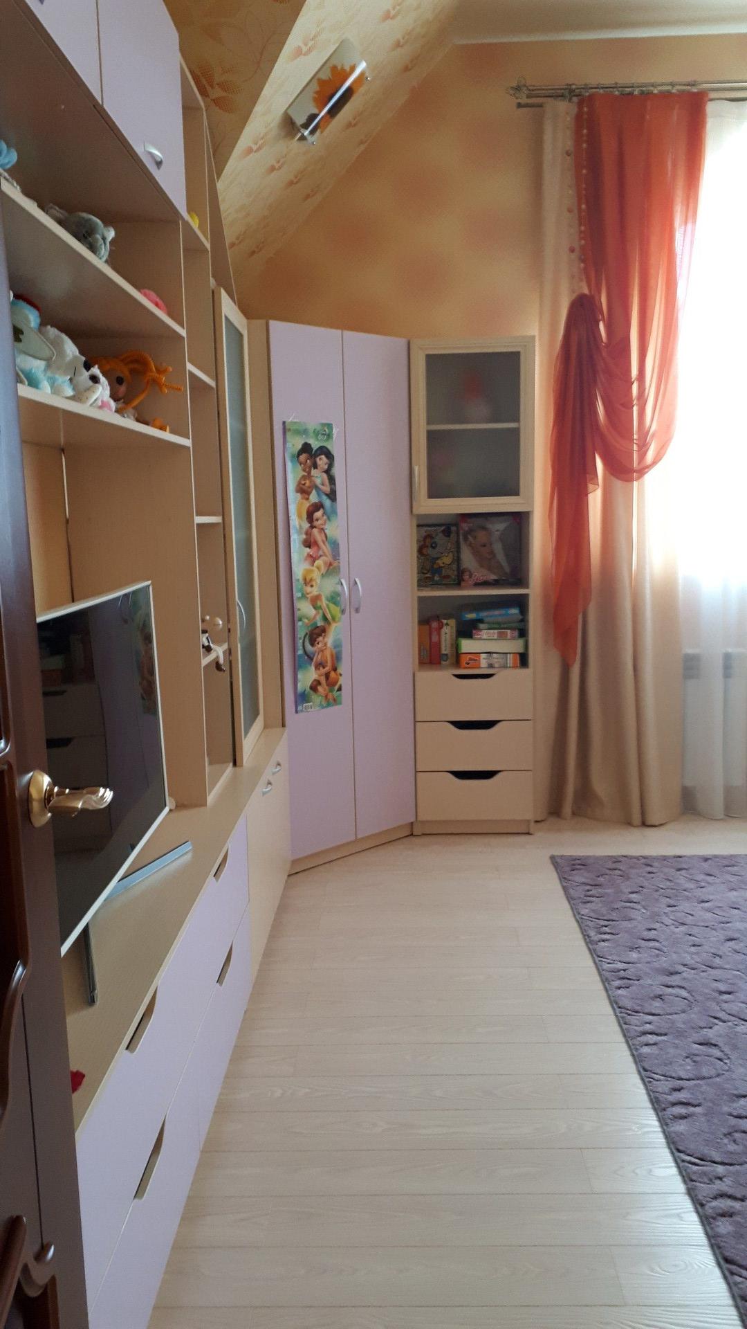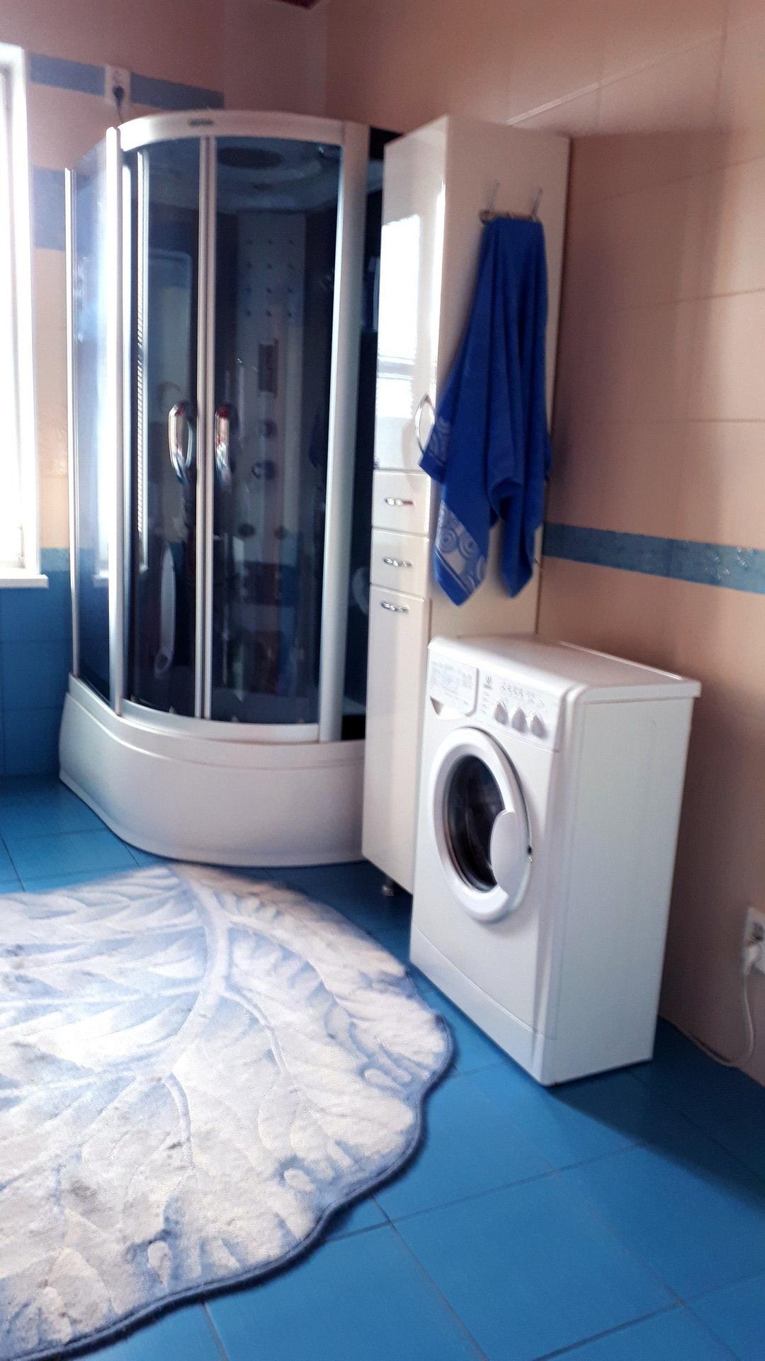 На 1 м этаже находится: большой холл, большая гостинная с кухней, кухонный гарнитур (3×8 пог.м) из массива с встроенной (посудом. машиной), 2 спальные комнаты, ванная комната, туалет.