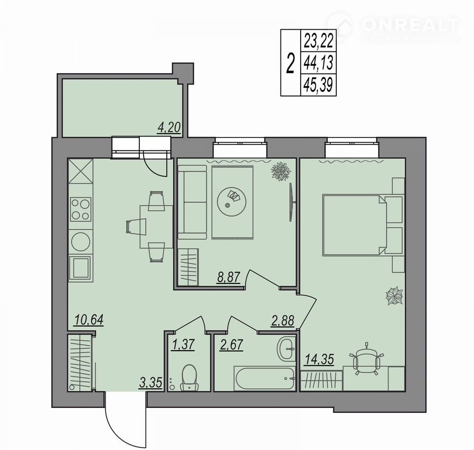 Общая площадь 45.4 м2