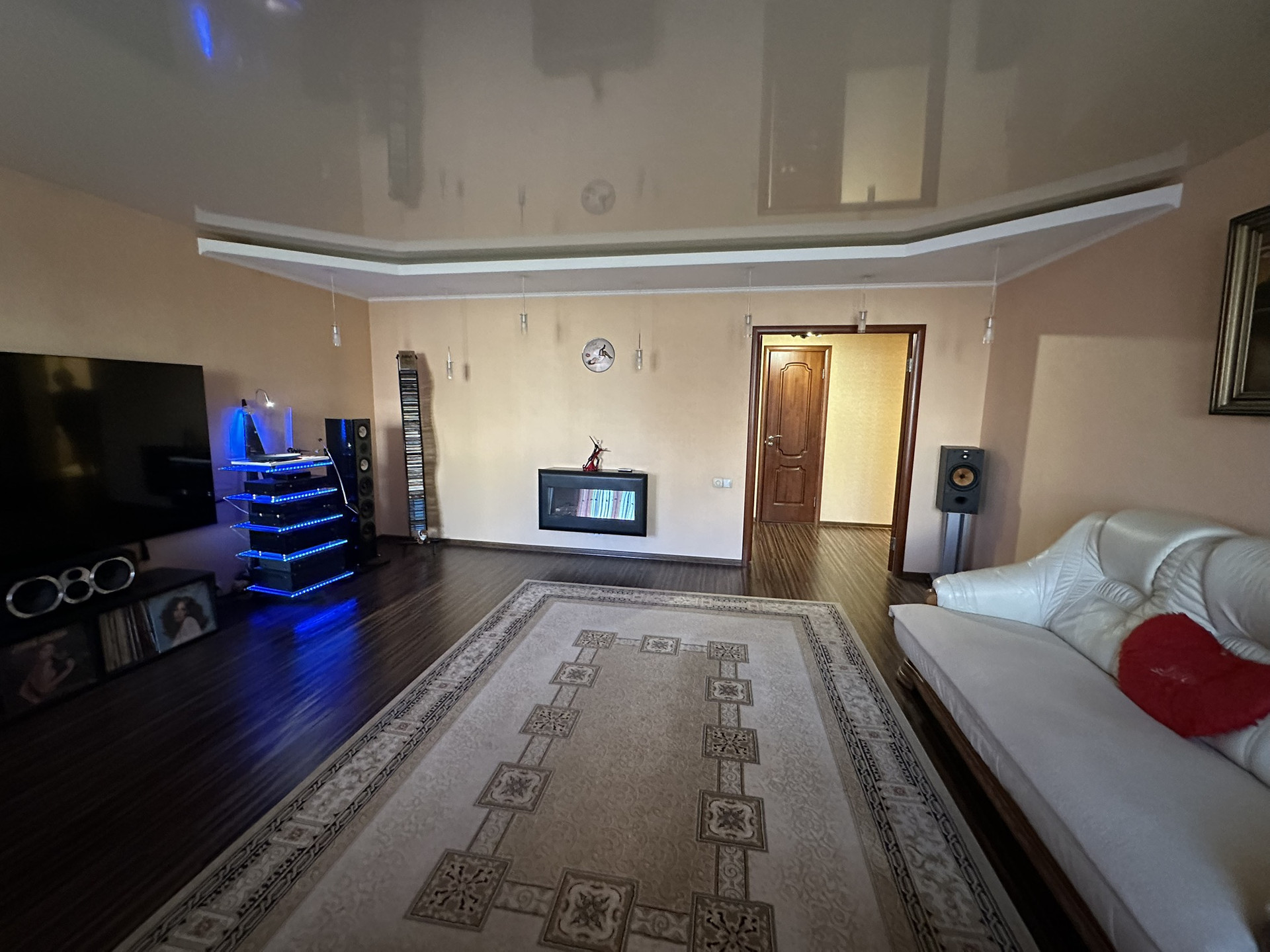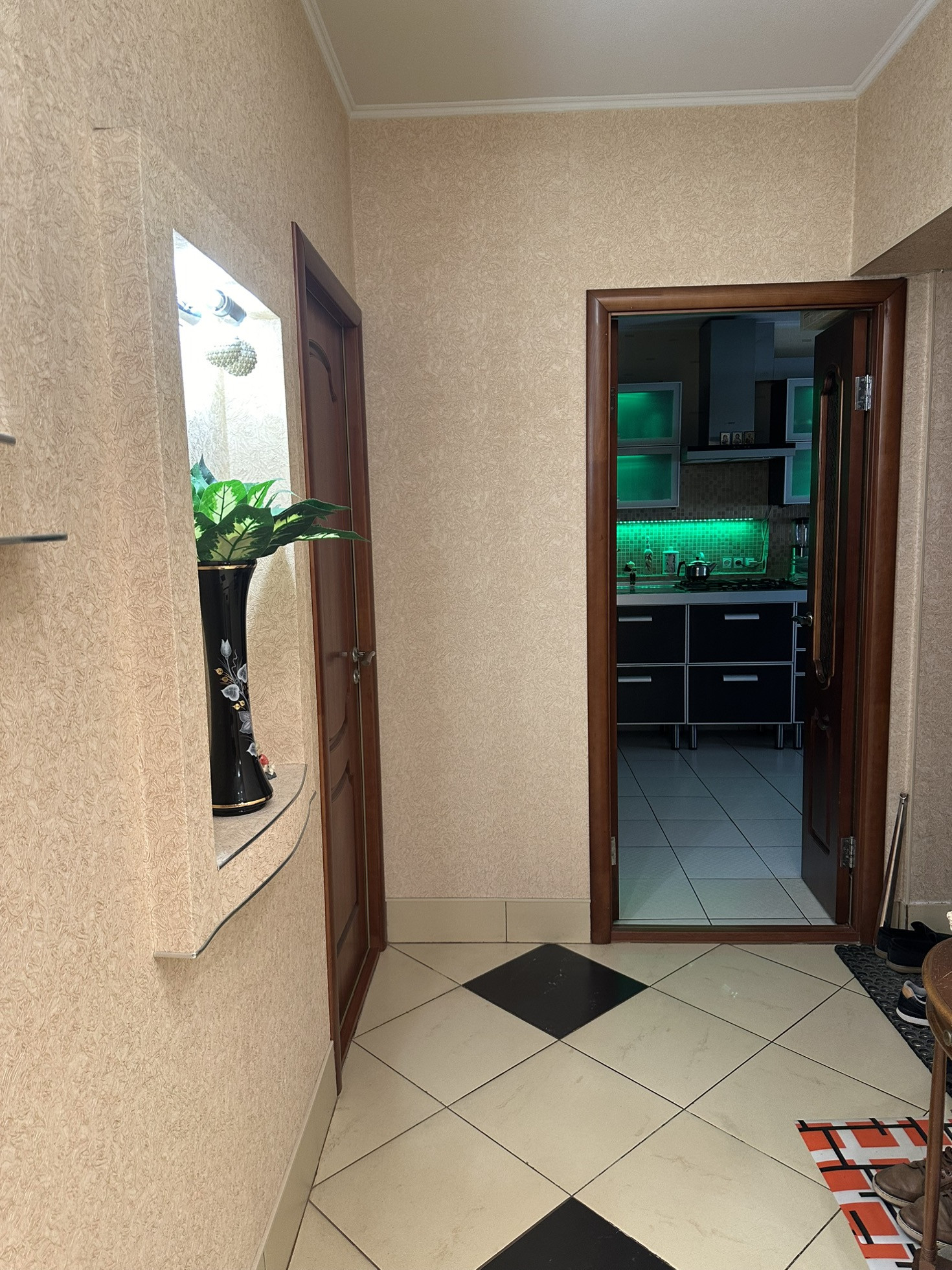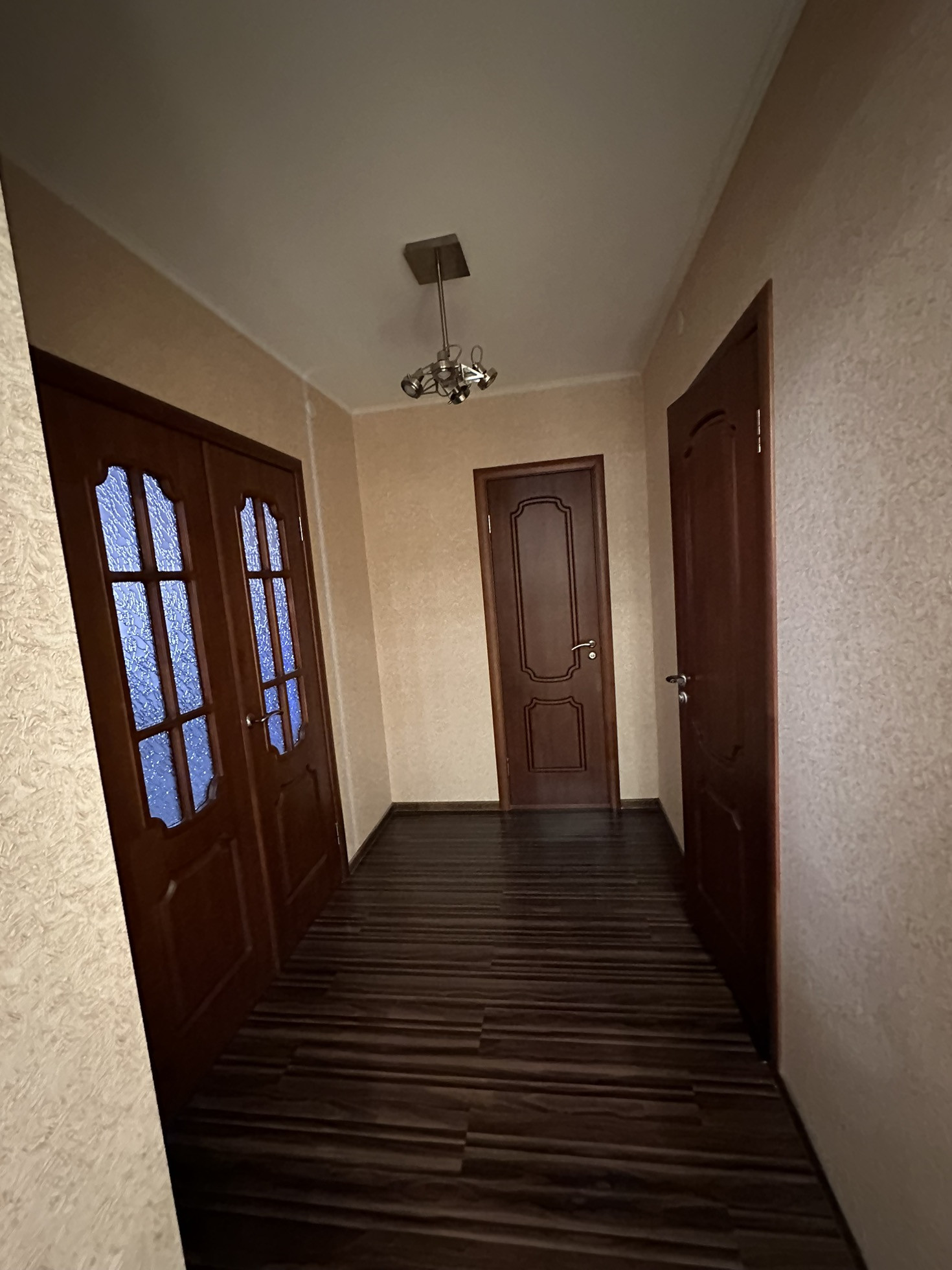 Ремонт сделан из дорогих и качественных итальянских и немецких  материалов . Межкомнатные двери с резиновыми уплотнителями из шпона махагона. Входная -бронированная сейф-дверь . В квартире много вариантов подсветки . В прихожей установлен вместительный шкаф-купе .