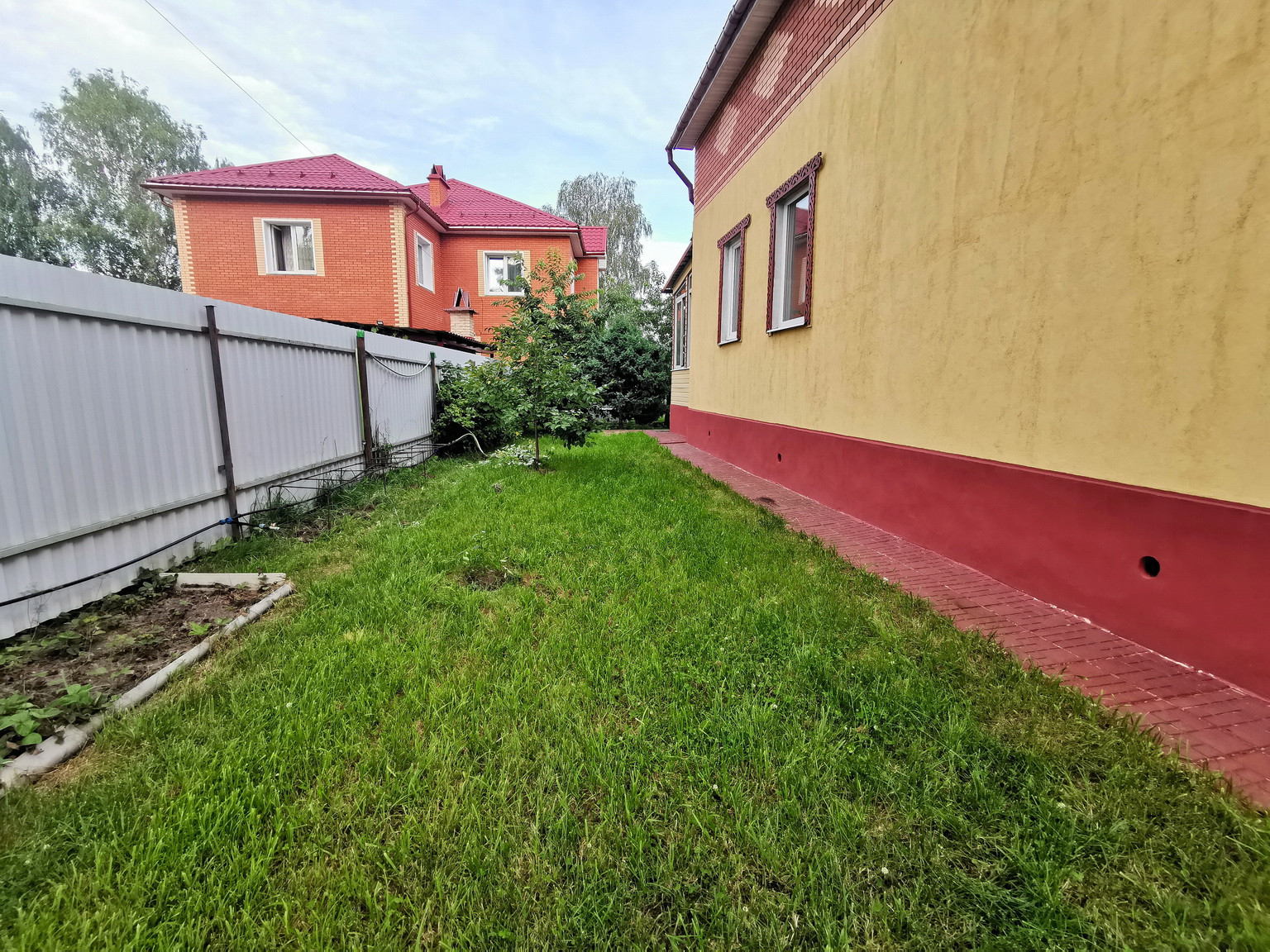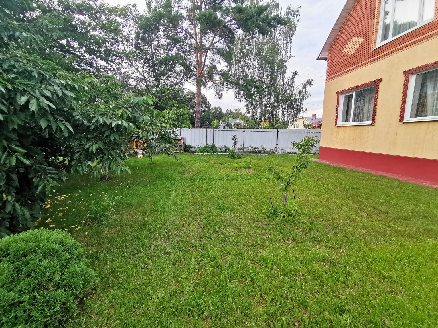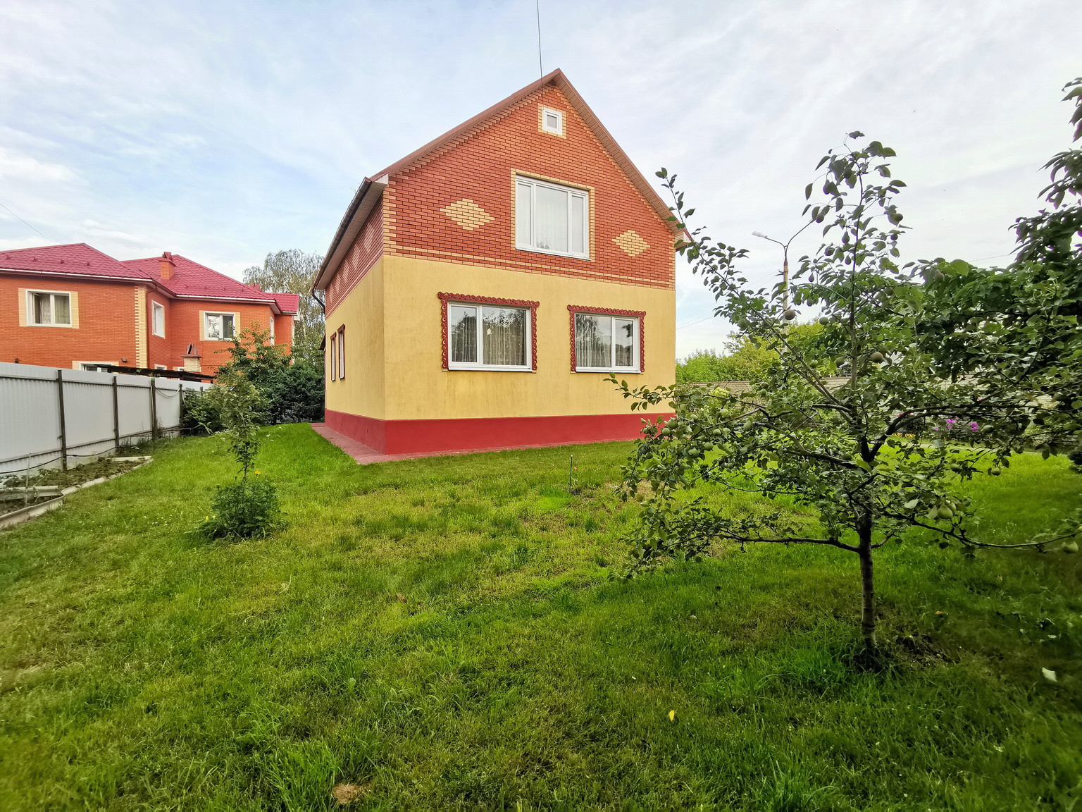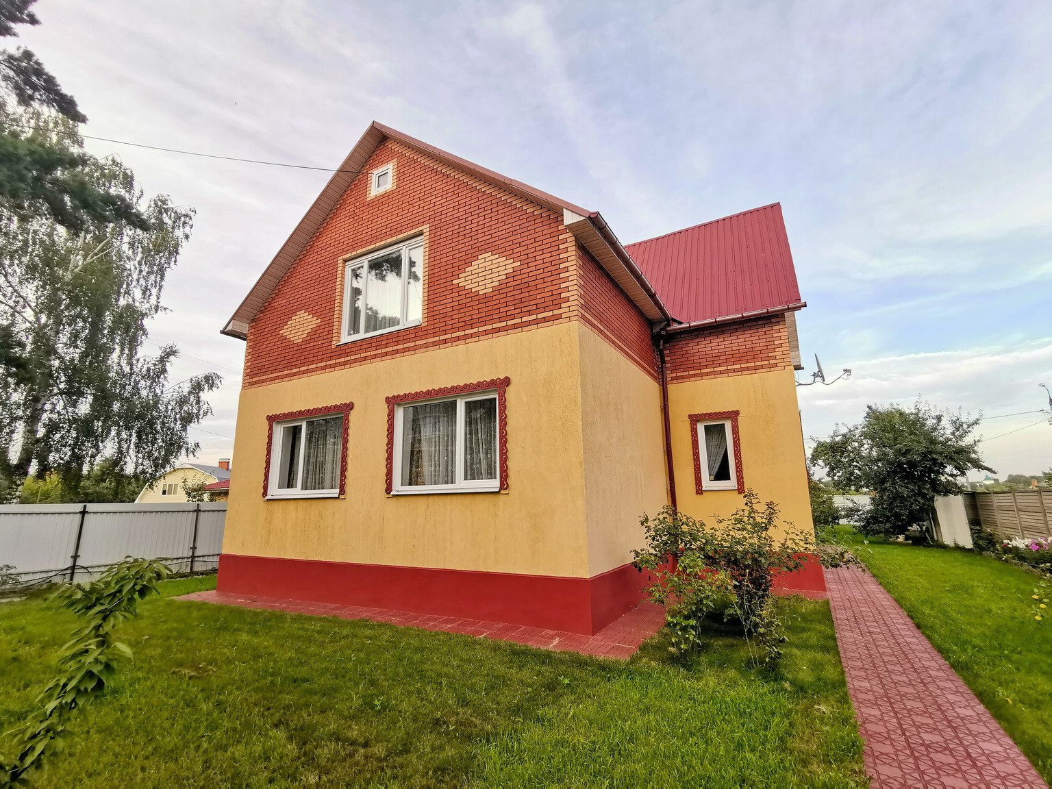 Дом площадью 150 кв.м, 2013 года постройки, брусовой, утеплен и обложен кирпичем, на ленточном фундаменте со всеми городскими коммуникациями: эл-во 15 кВт, газ (отопление и горячая вода - двухконтурный газовый котел), центральное водоснабжение, канализация, интернет. Первый этаж состоит из веранды, коридора, кухни-гостиной, большой спальни и сан.узла. На втором этаже - зал, спальня, туалет и лестница на чердак, также в доме есть подвальное помещение.