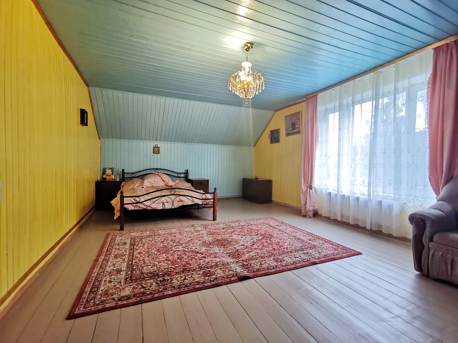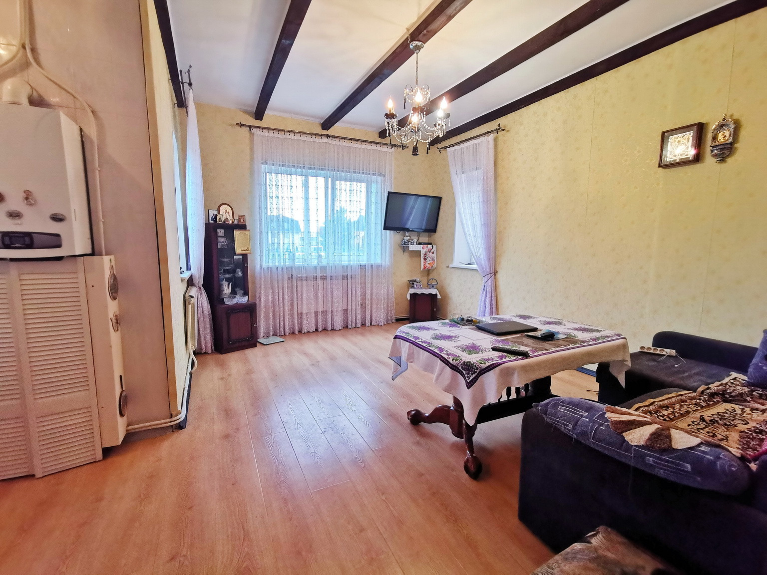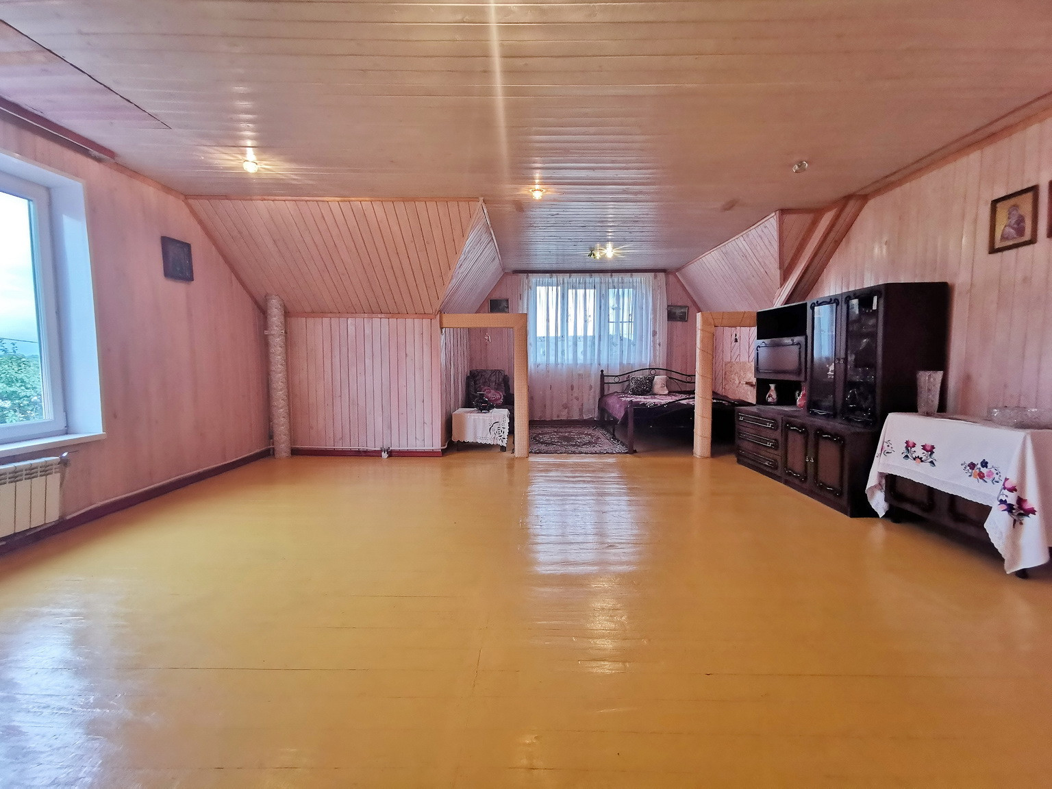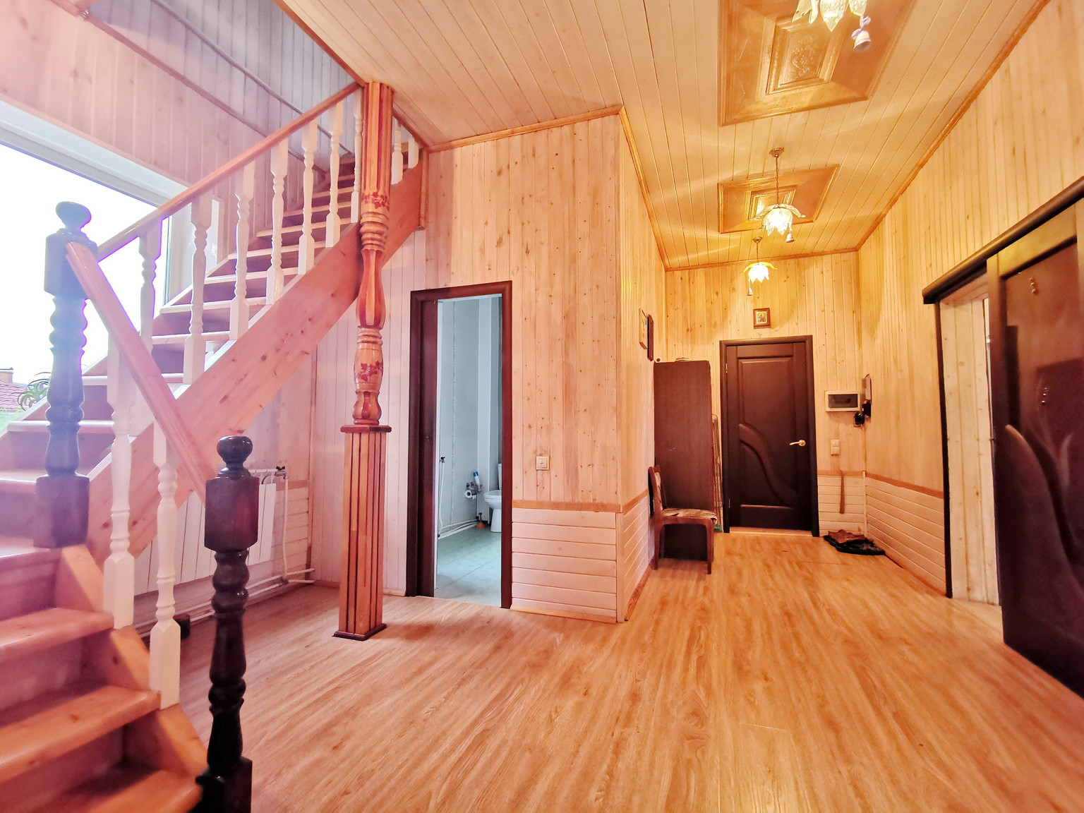 Дом площадью 150 кв.м, 2013 года постройки, брусовой, утеплен и обложен кирпичем, на ленточном фундаменте со всеми городскими коммуникациями: эл-во 15 кВт, газ (отопление и горячая вода - двухконтурный газовый котел), центральное водоснабжение, канализация, интернет. Первый этаж состоит из веранды, коридора, кухни-гостиной, большой спальни и сан.узла. На втором этаже - зал, спальня, туалет и лестница на чердак, также в доме есть подвальное помещение.