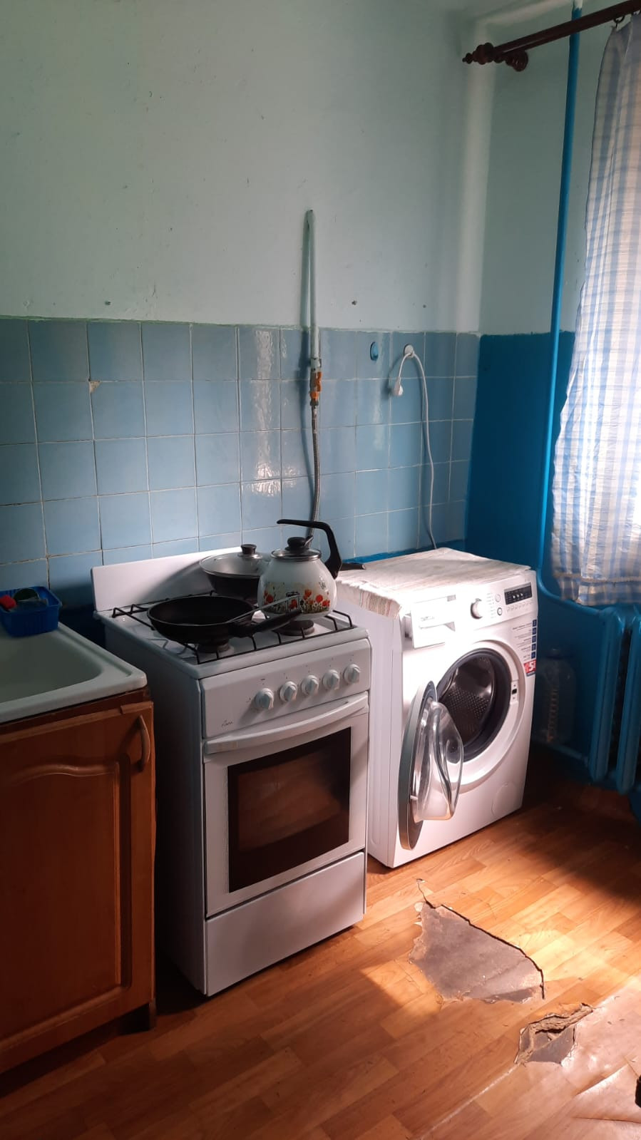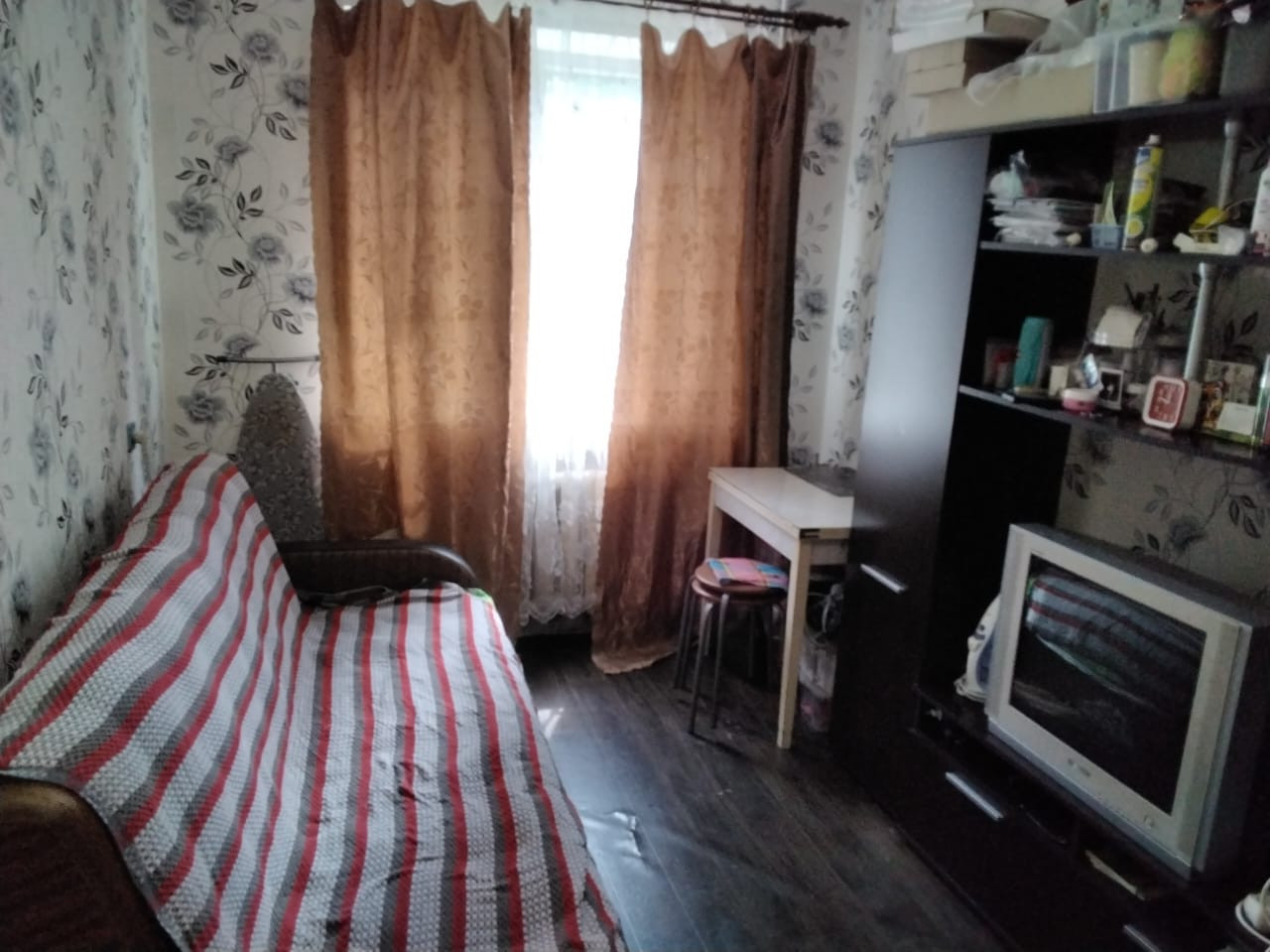 Располагается на 1 этаже 5 этажного панельного дома. Соседи семья, занимает две комнаты.