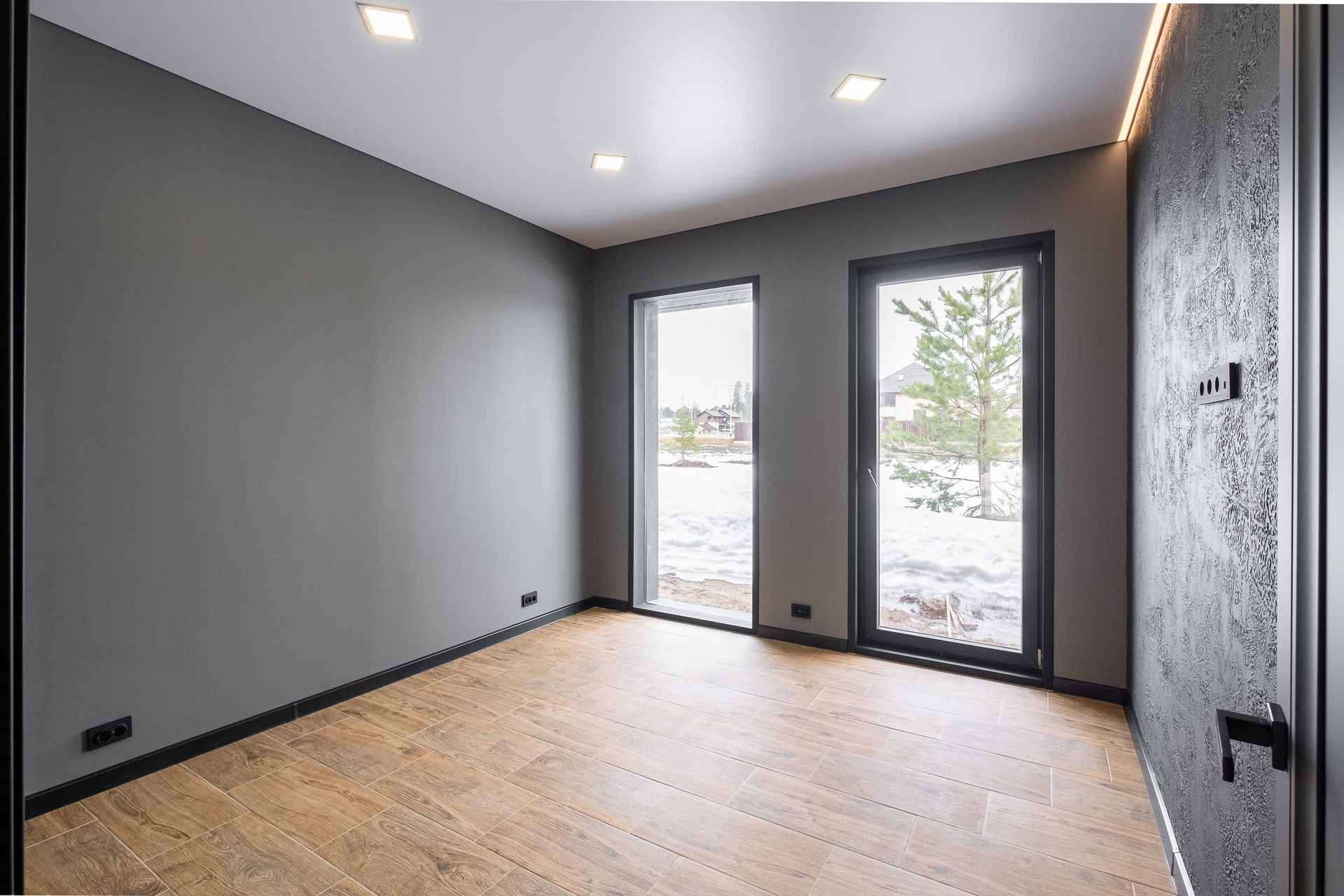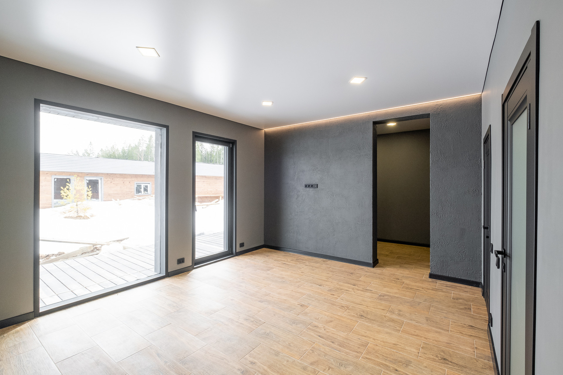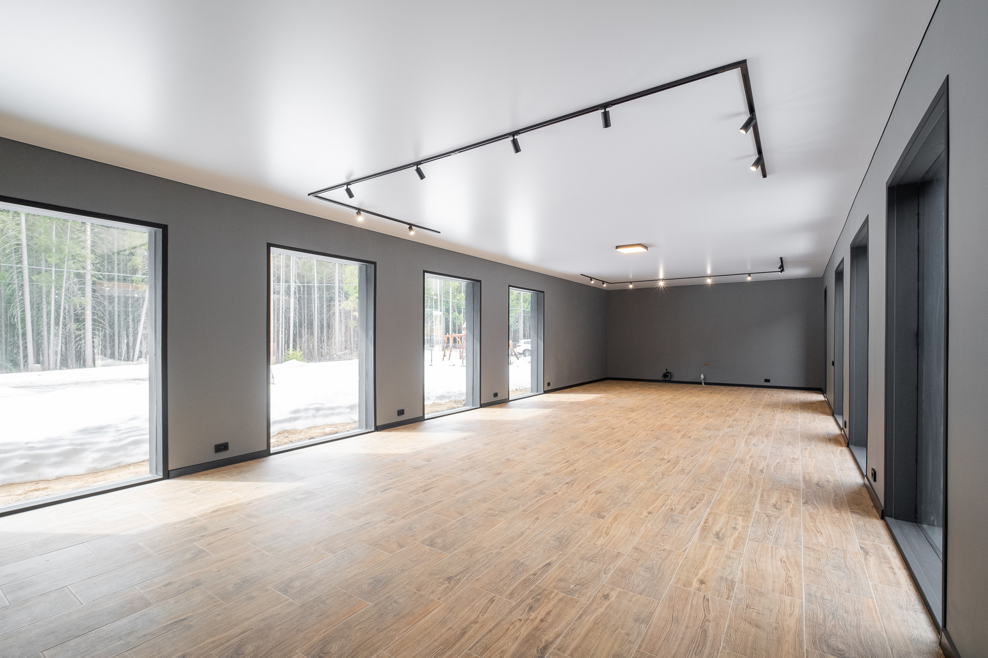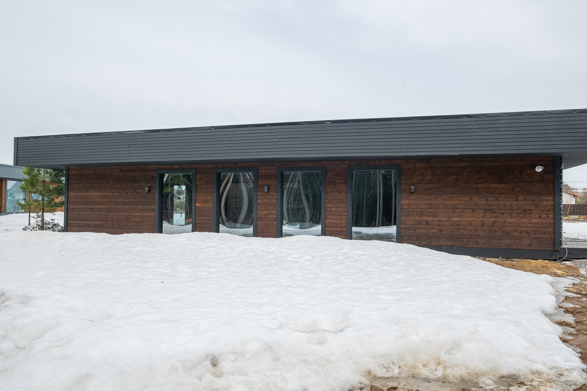 Во всех окнах в пол красивый вид из окна на лес, который так и останется красивым, так как дальше застройки уже не будет.