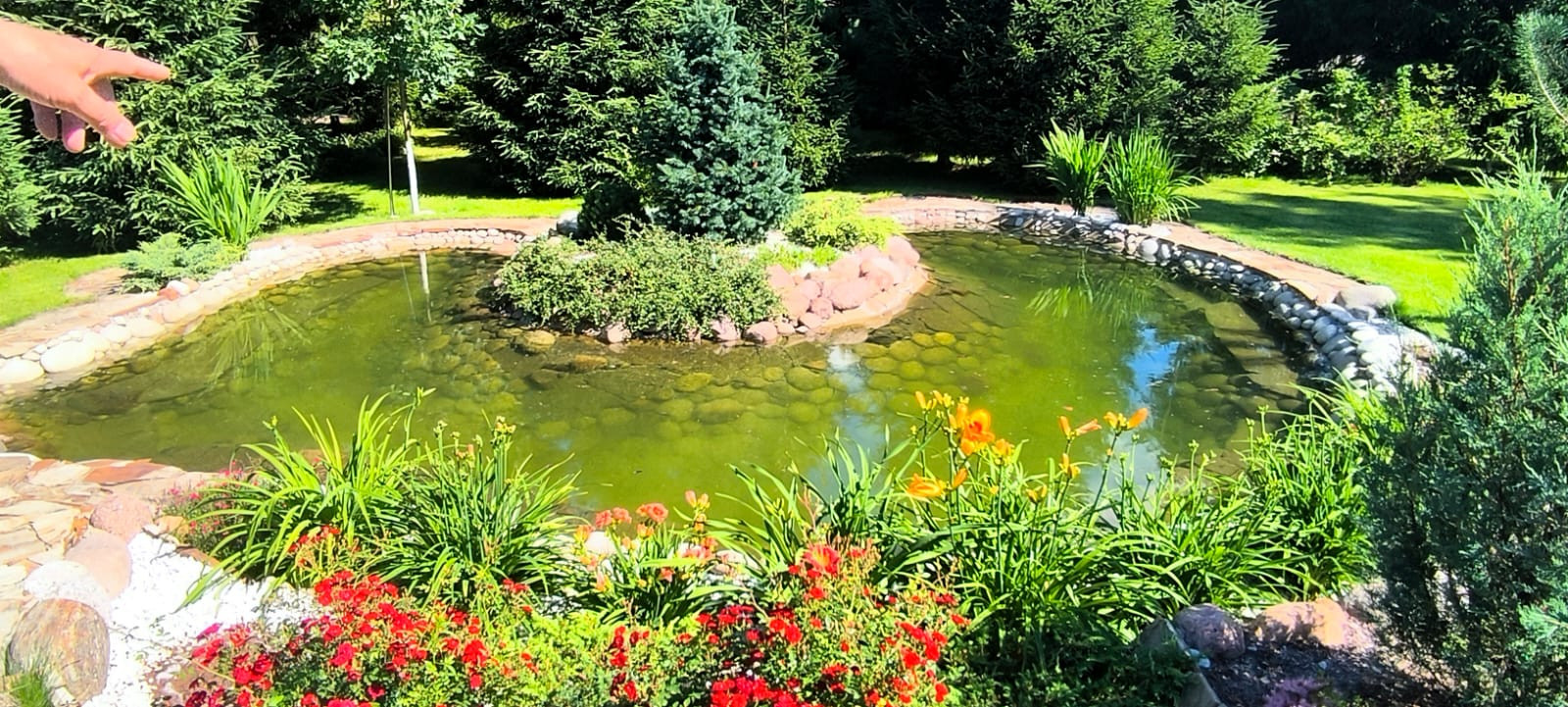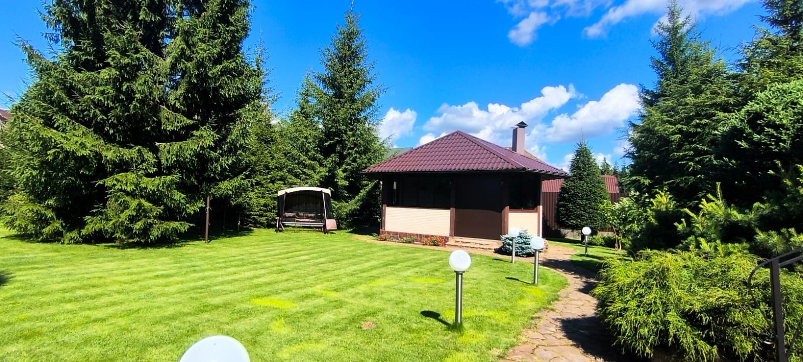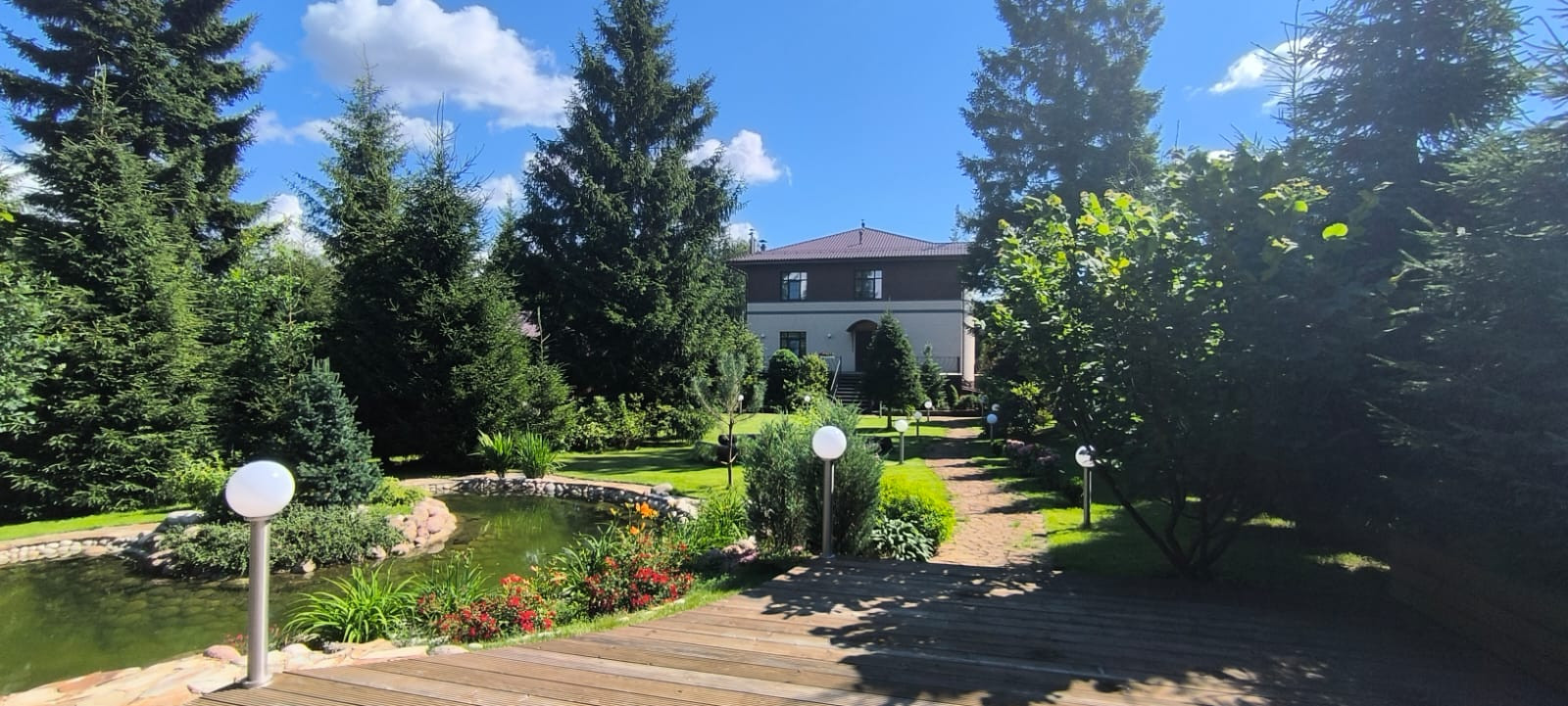 На участке выполнен ландшафтный дизайн- с большой любовью и заботой выращены редкие виды деревьев, кустарников и цветов. Выполнено зонирование: в зоне отдыха размещен искусственный пруд с водопадом, лаунж-зона с шезлонгами, заглубленный очаг успокаивает, вызывает желание подольше посидеть и отвлечься от бытовых проблем. Теплая беседка с мангальной зоной, водопроводом и кухонными принадлежностями может использоваться круглый год и станет притяжением для Вас и Ваших гостей.