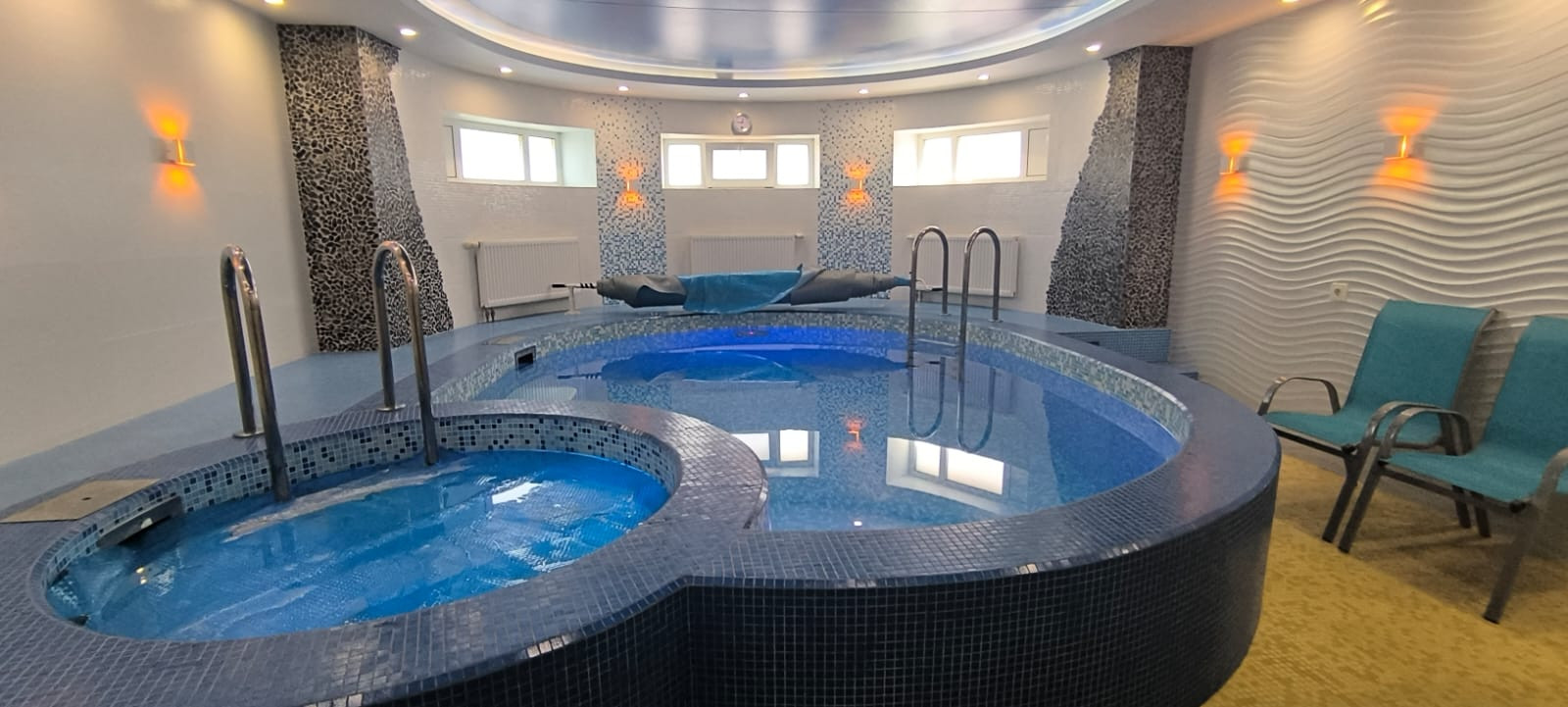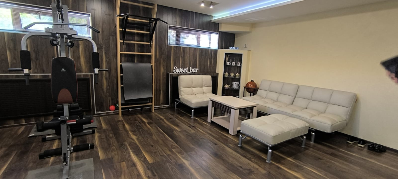 В полуцокольном помещении размещен бассейн с противотоком, купель, сауна, тренажерный зал, чайная комната отдыха, оборудованная скрытой акустической системой Pioneer и домашним кинотеатром. Магистральный газ и электричество 15 КВт, скважина глубиной 85 метров до Ломоносовского водоносного горизонта. Канализация локальная (септик).