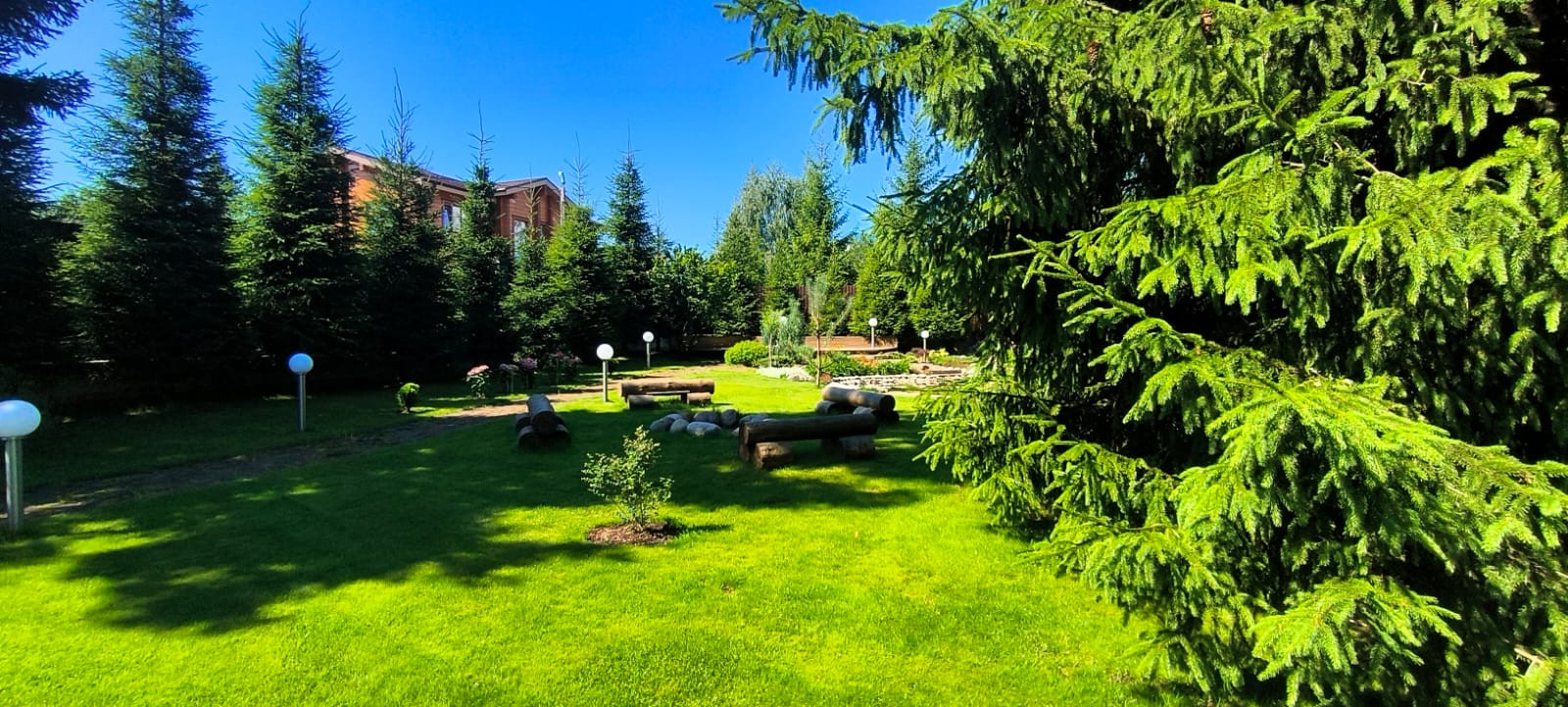 Участок отсыпан песком на 1м, выполнен дренаж, ливневка на участке и вдоль забора, выращен газон, уложена система автополива газона, деревьев и кустарников.