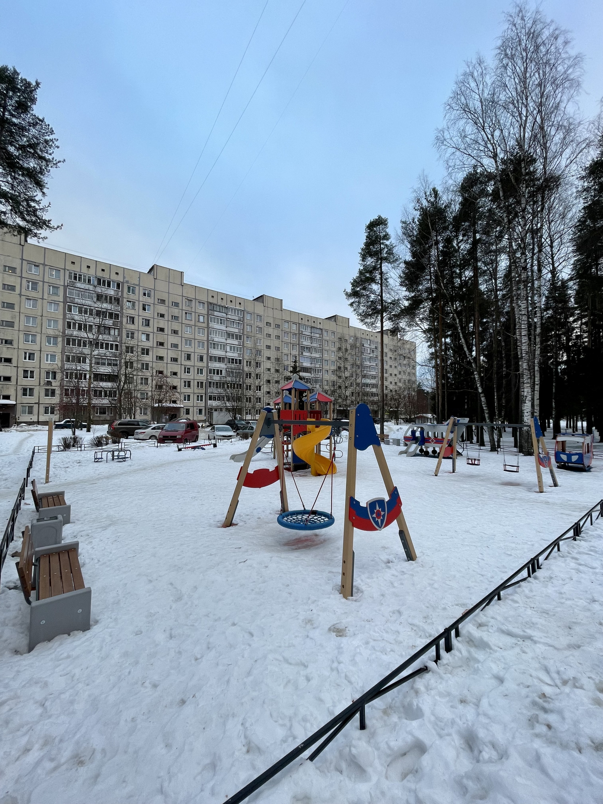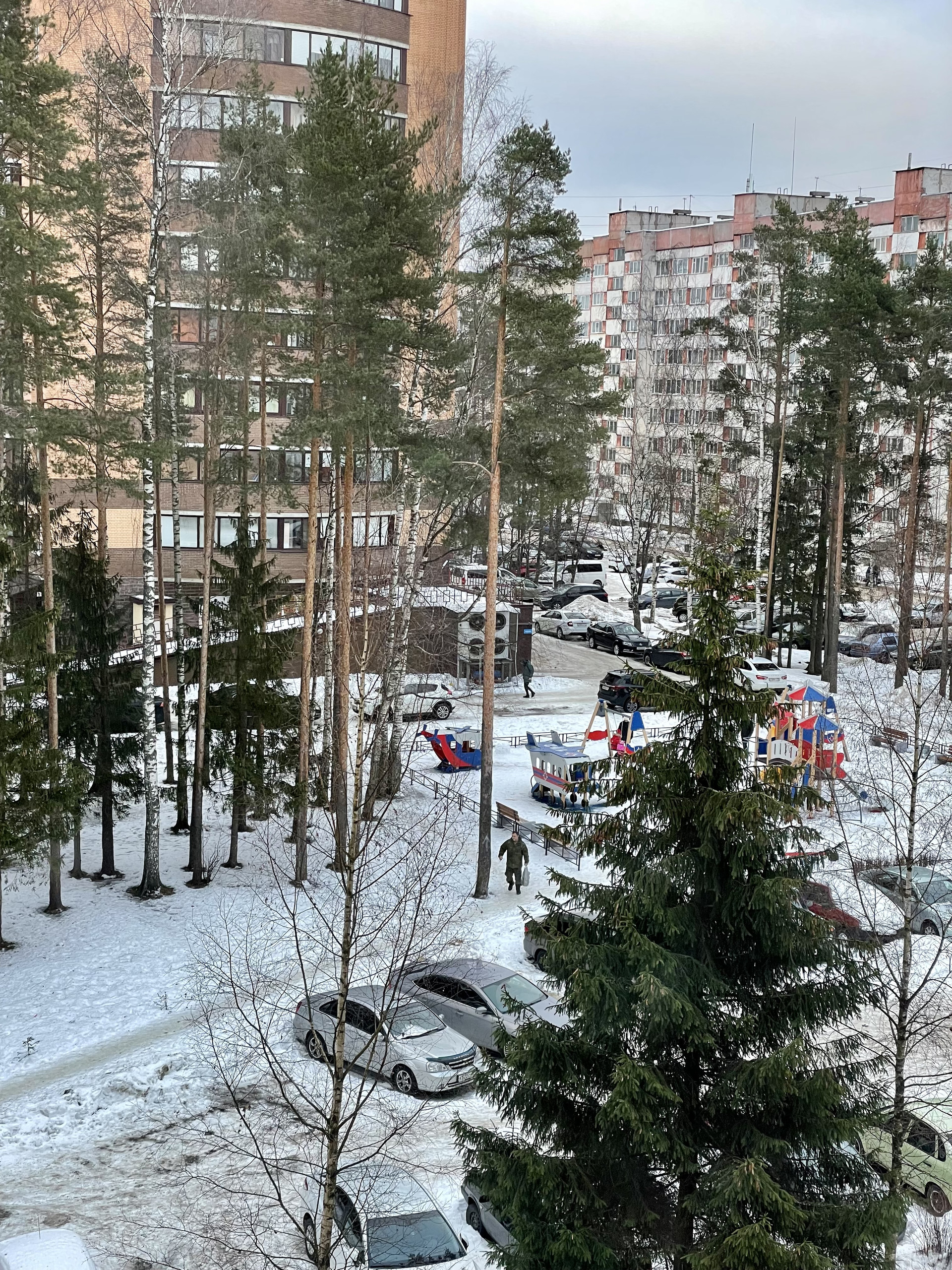 -Из окон вид на детскую площадку в окружении сосен и тихий двор.