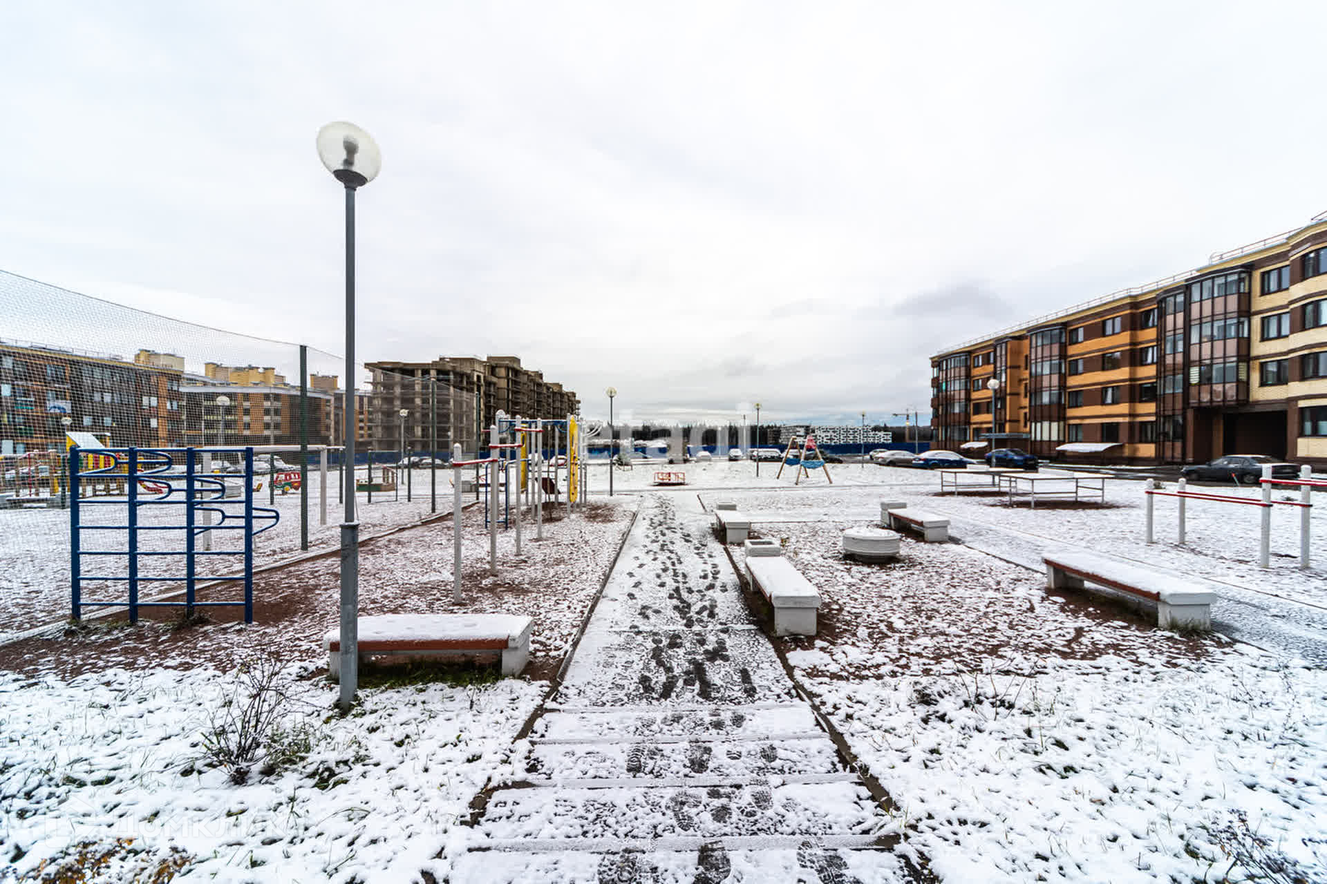 Во дворе большая парковка и детская площадка.