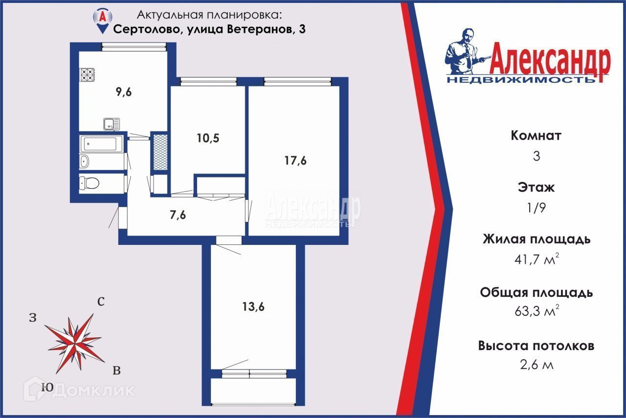 3-комнатная квартира, 63.3 м2, этаж 1 / 9, на продажу в Сертолово, улица Ветеранов, 3