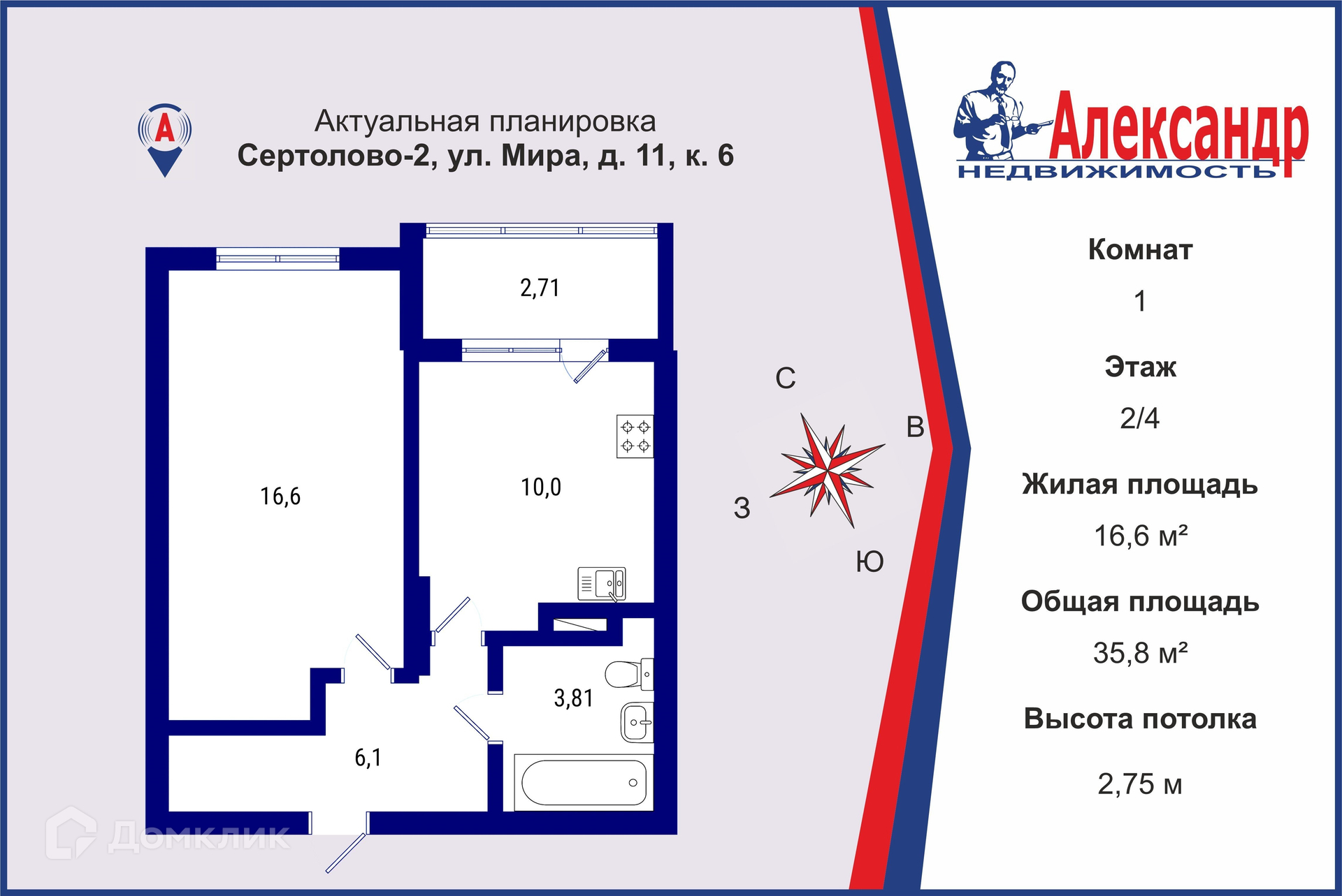 1-комнатная квартира, 35.8 м2, этаж 2 / 4, на продажу в Сертолово, улица Мира, 11к6