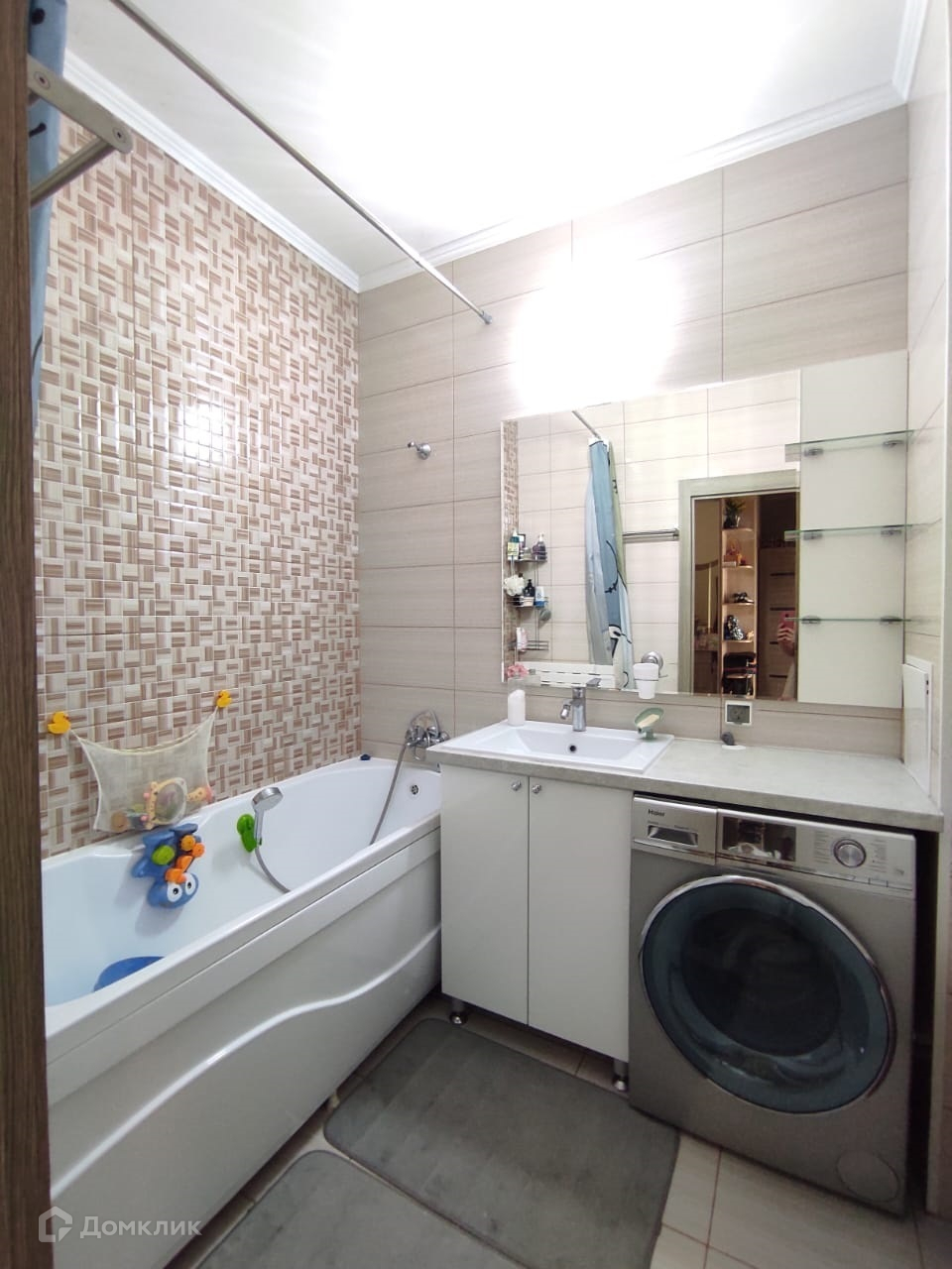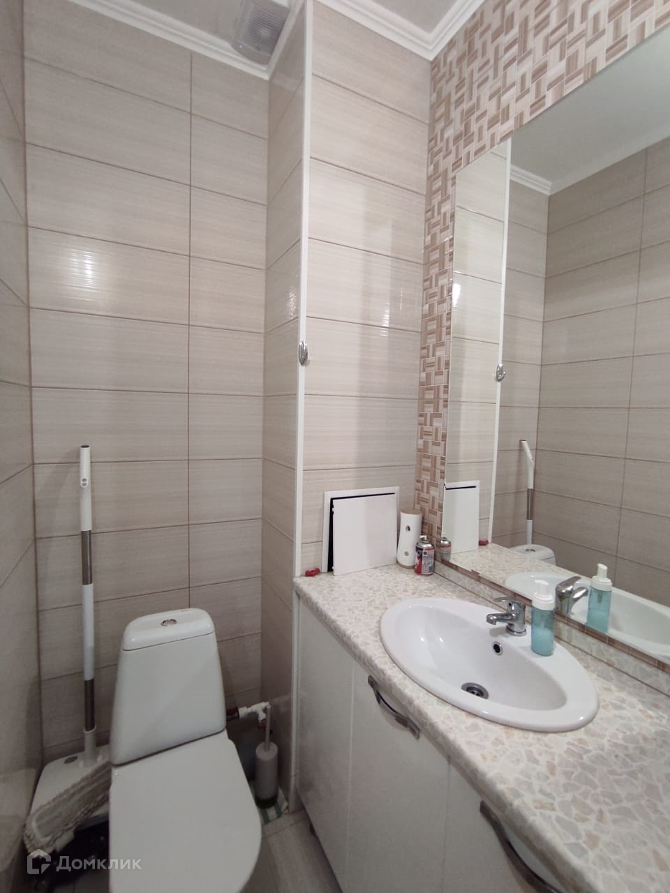 Раздельный санузел с дизайнерской отделкой кафелем. Оба помещения (ванная и туалет) просторные, со встроенными шкафами