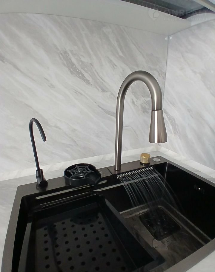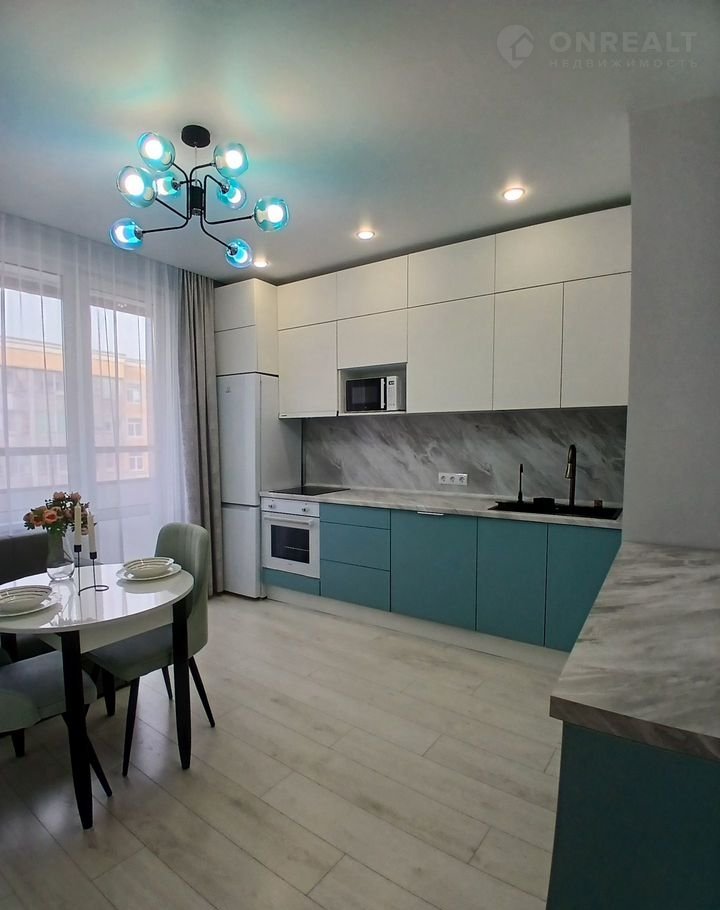 Кухня 12,2 метра полностью укомплектована( индукционная варочная панель, духовой шкаф, посудомойка, встроенная вытяжка, умная раковина).