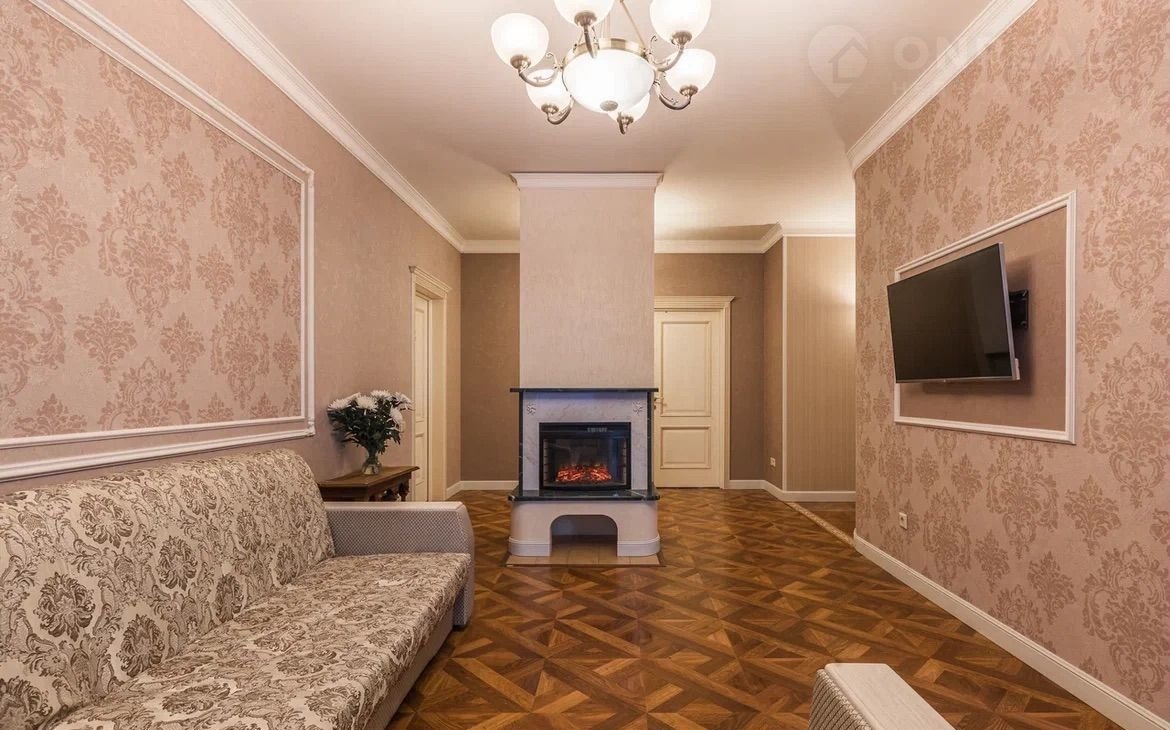 В квартире остаётся кухонный гарнитур из массива со встроенной техникой, камин, диван и телевизор. Остальная мебель — по договорённости.