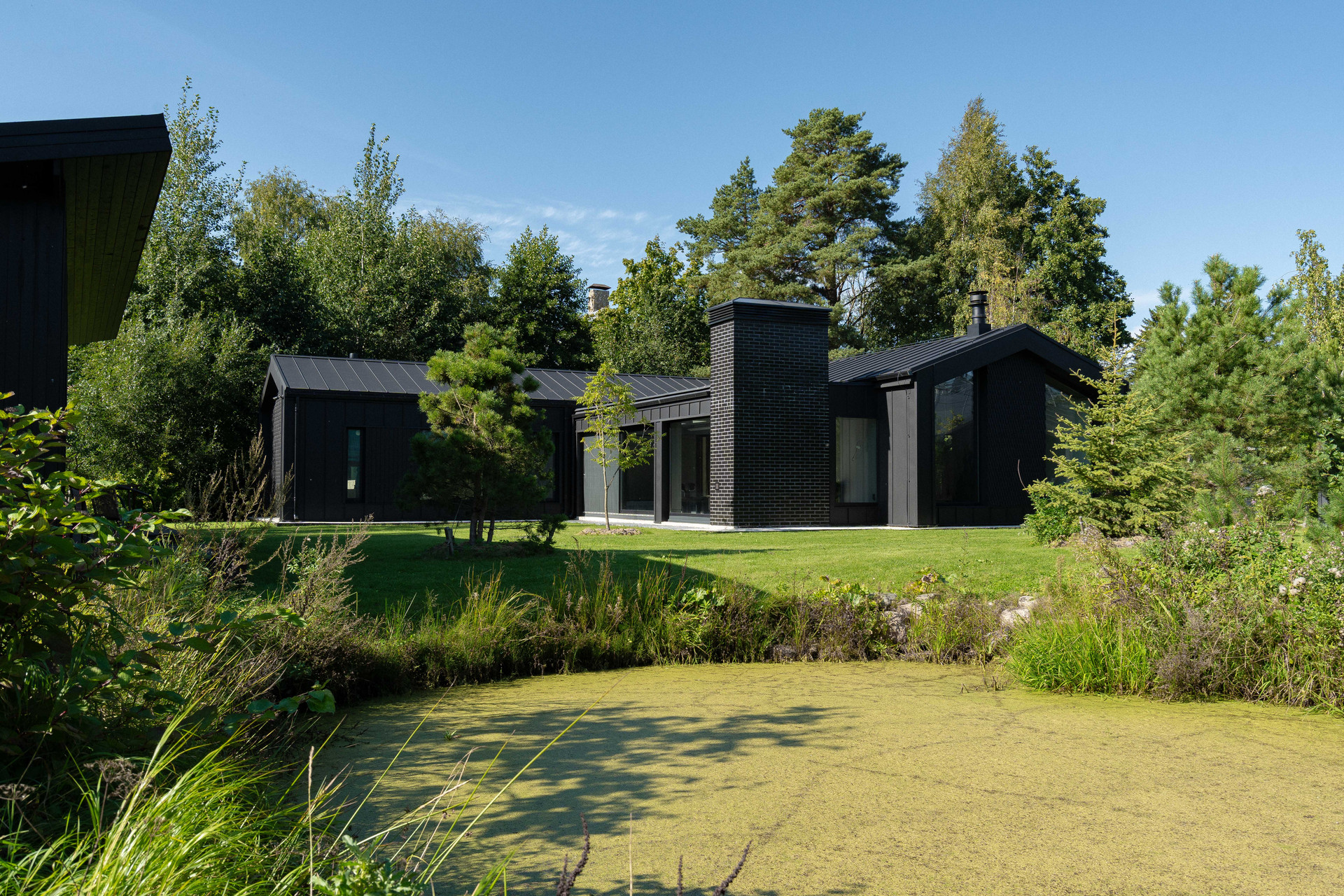 - на участке высажен газон, есть собственный пруд;