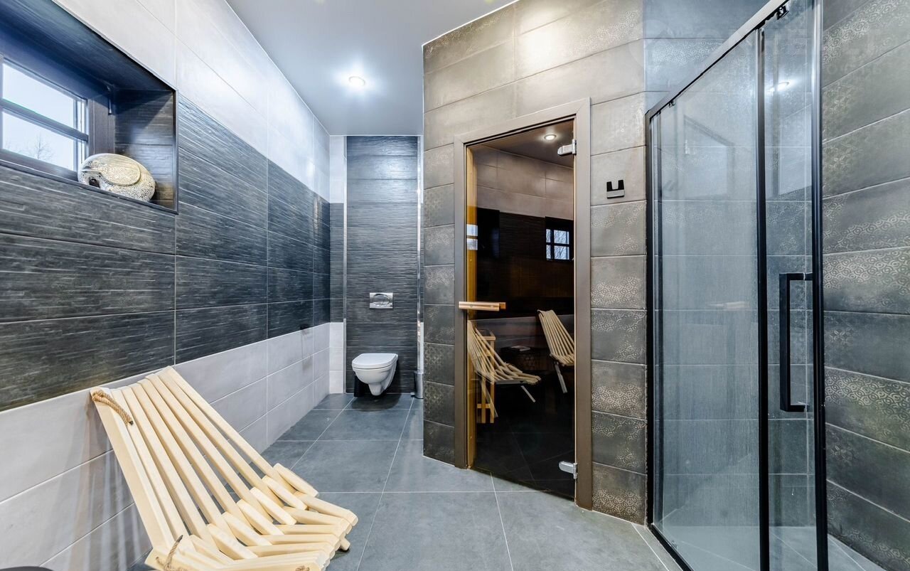 — 3 санузла, с ванной, сауной, душевой кабиной и постирочной ( 14,9 + 10,2 + 4,9 ). 2 санузла на 1 этаже и один - на втором.