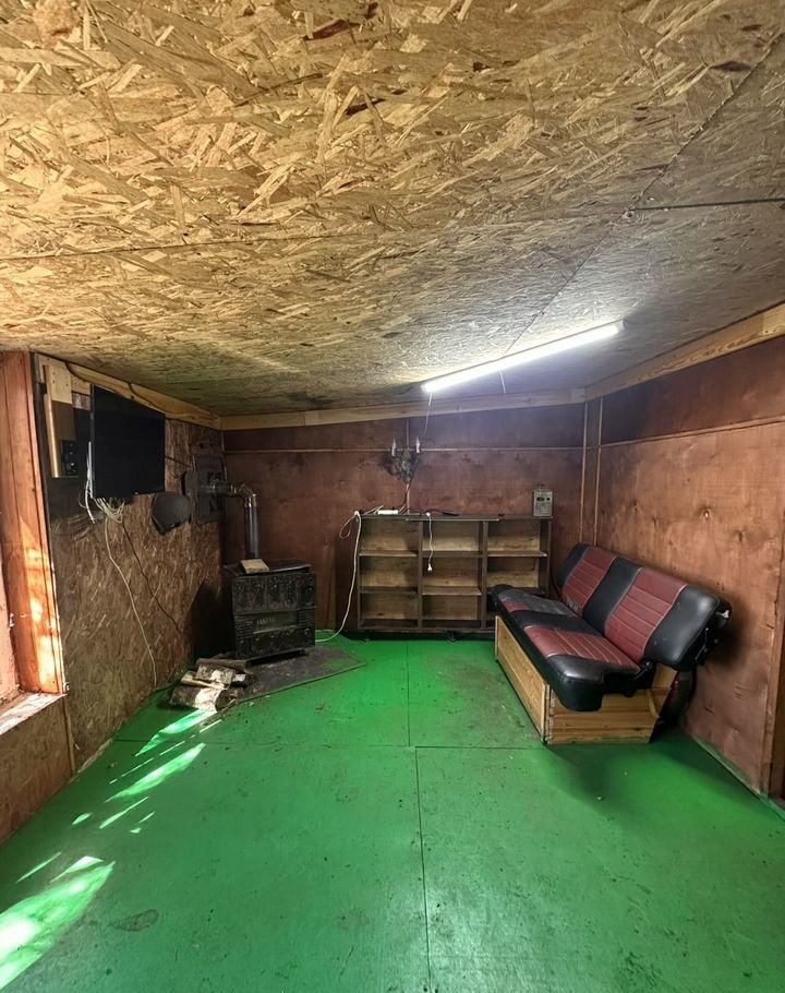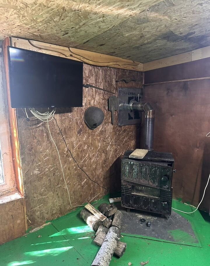 На втором этаже: кухня,кладовая и гостиная с телевизором и чугунной дровяной печью.