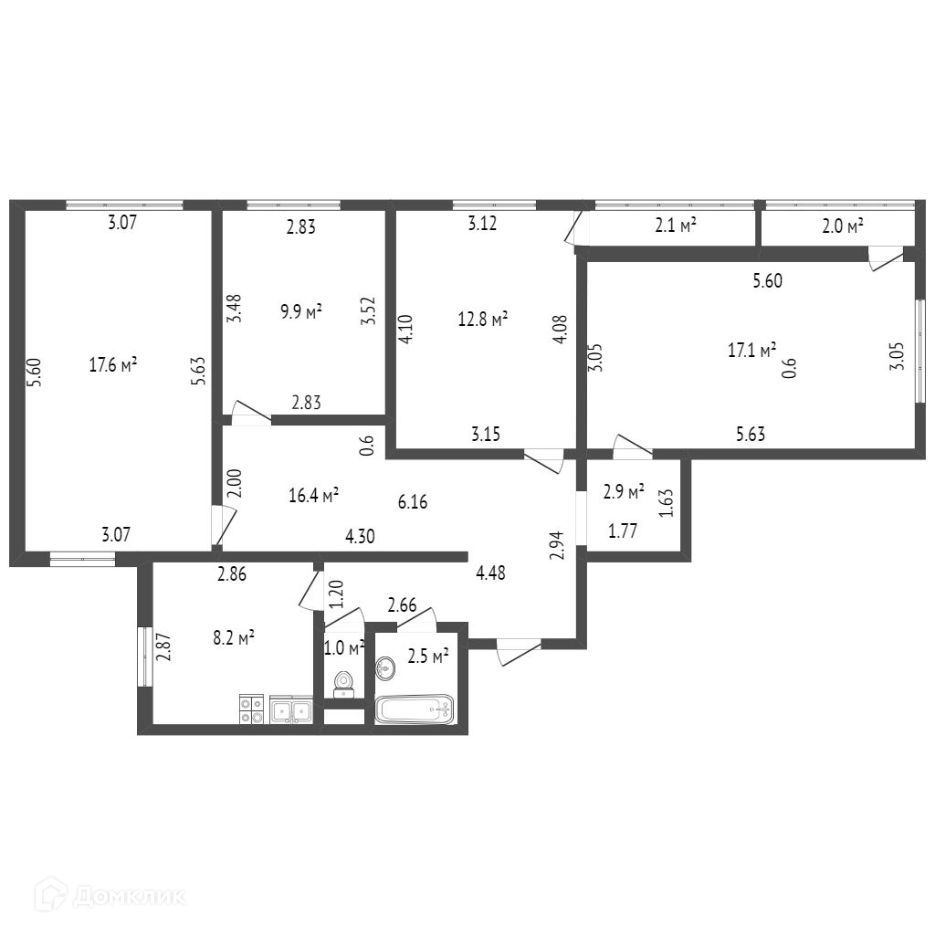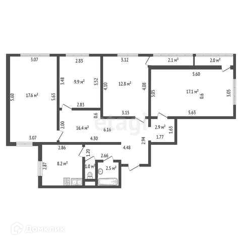 Четыре изолированные комнаты: 17,6, 17,1, 12,8, 9,9.
