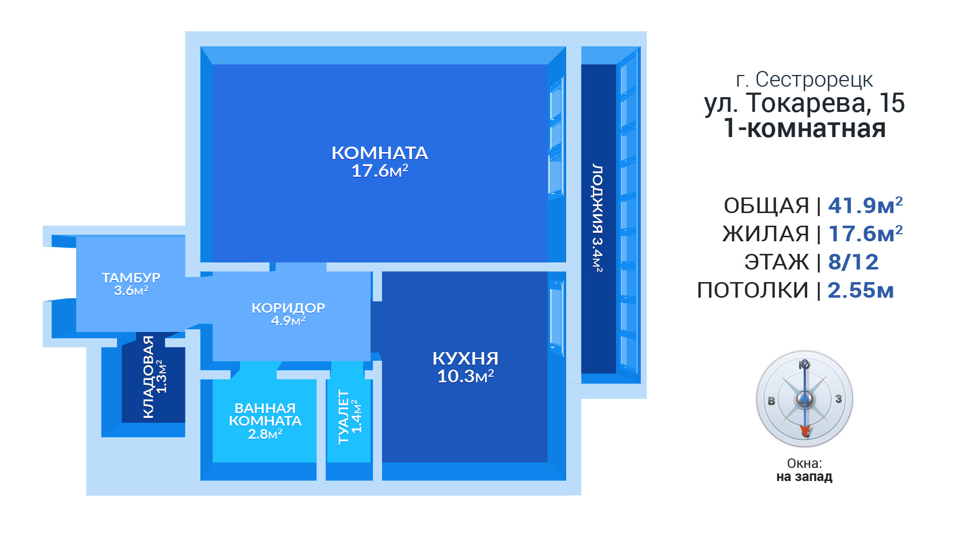 1-комнатная квартира, 42 м2, этаж 8 / 12, на продажу в Сестрорецке, улица Токарева, 15