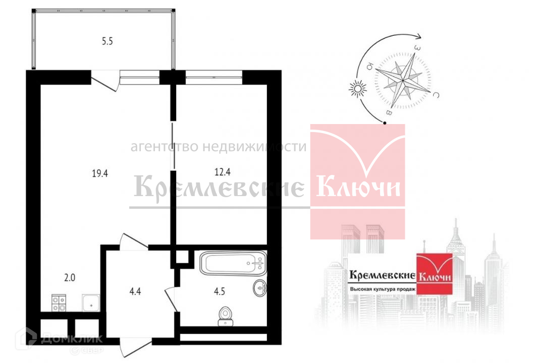 Современная удобная планировка евро-двушки с большим застеклённым балконом 5,5 м2