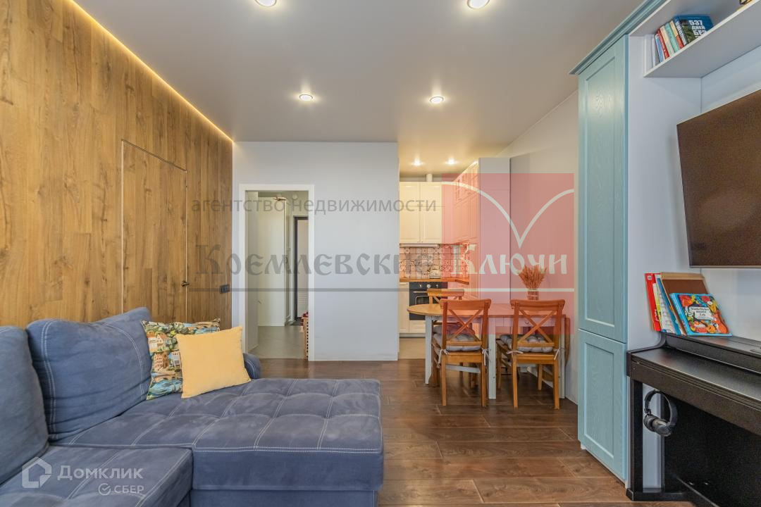 Дизайнерское решение по расположению кухни, находящейся в нише, позволило использовать всю остальную площадь для создания полноценной уютной гостиной