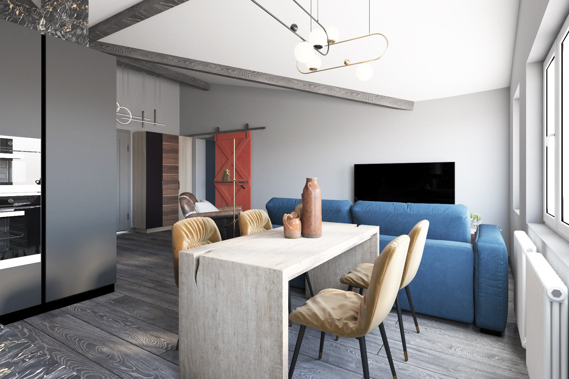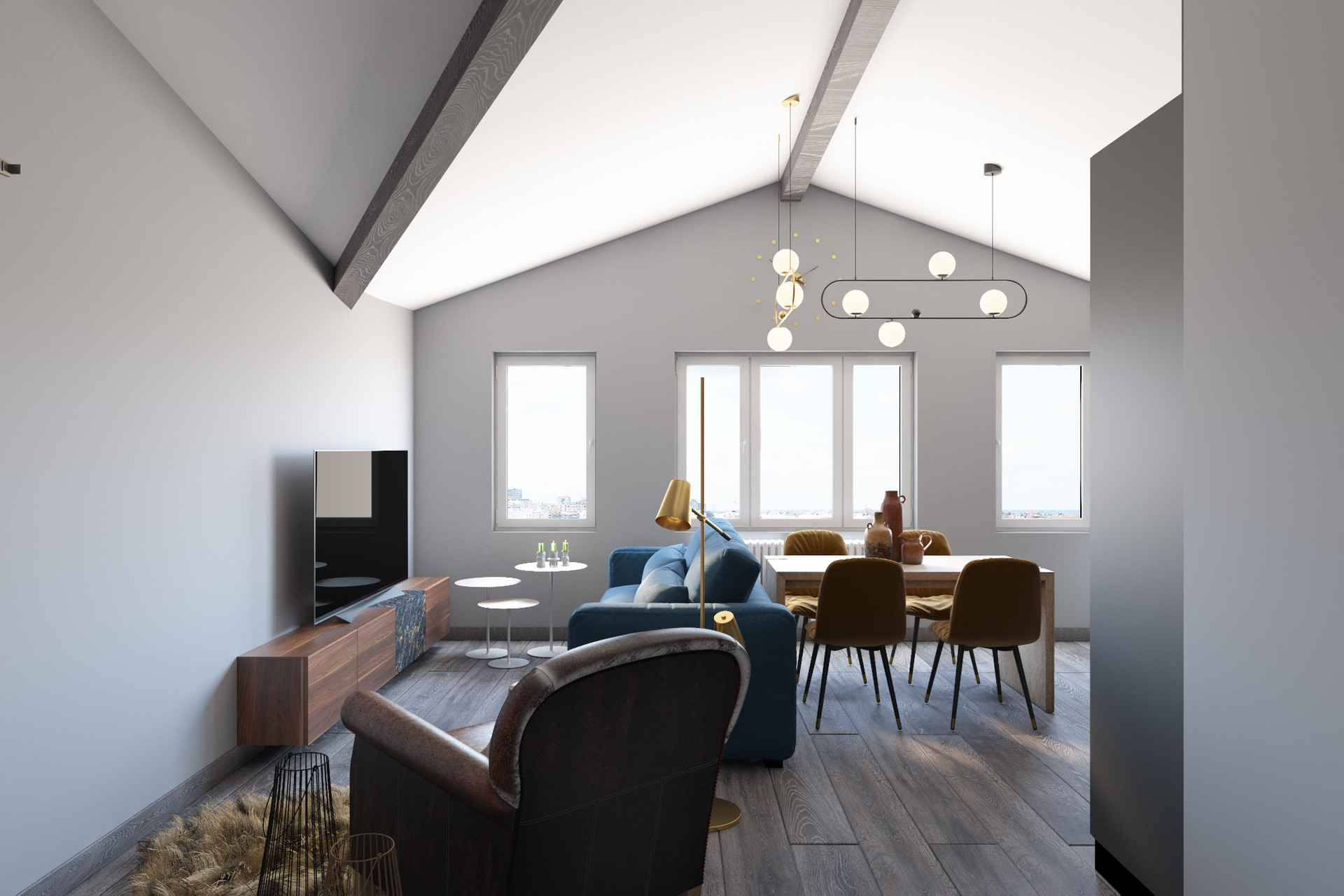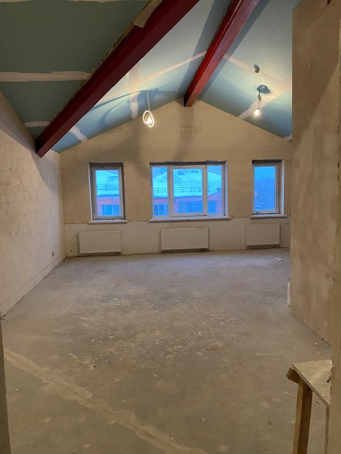 Большая и квадратная кухня-гостиная 32,3 кв.м. + 1 спальня 22,3 кв.м. В спальне мансардное окно, в кухне-гостиной обычные окна. Высота потолков до 3.8 м.