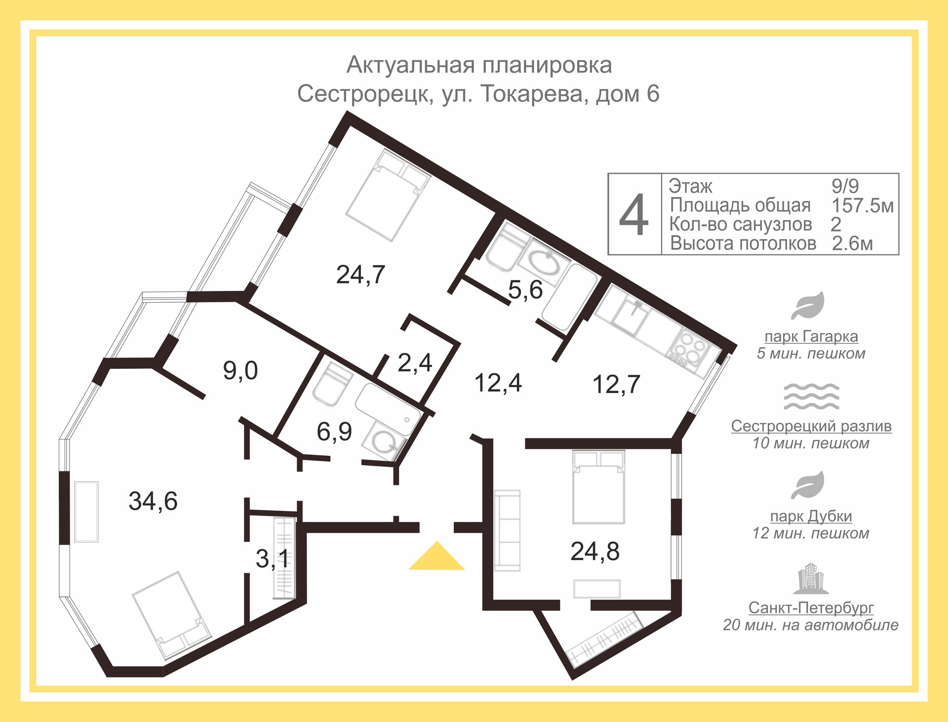 ✅ В квартире комфортная планировка: комнаты площадью 34,6 24,7 24,8 и 9 квадратных метров. В ТРЕХ комнатах организованы ГАРДЕРОБНЫЕ. Кухня, площадью 12,7 квадратных метров. Две ванные комнаты и две, застекленные лоджии.