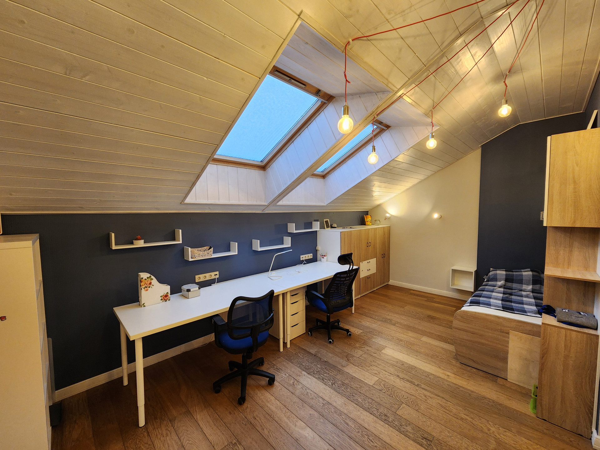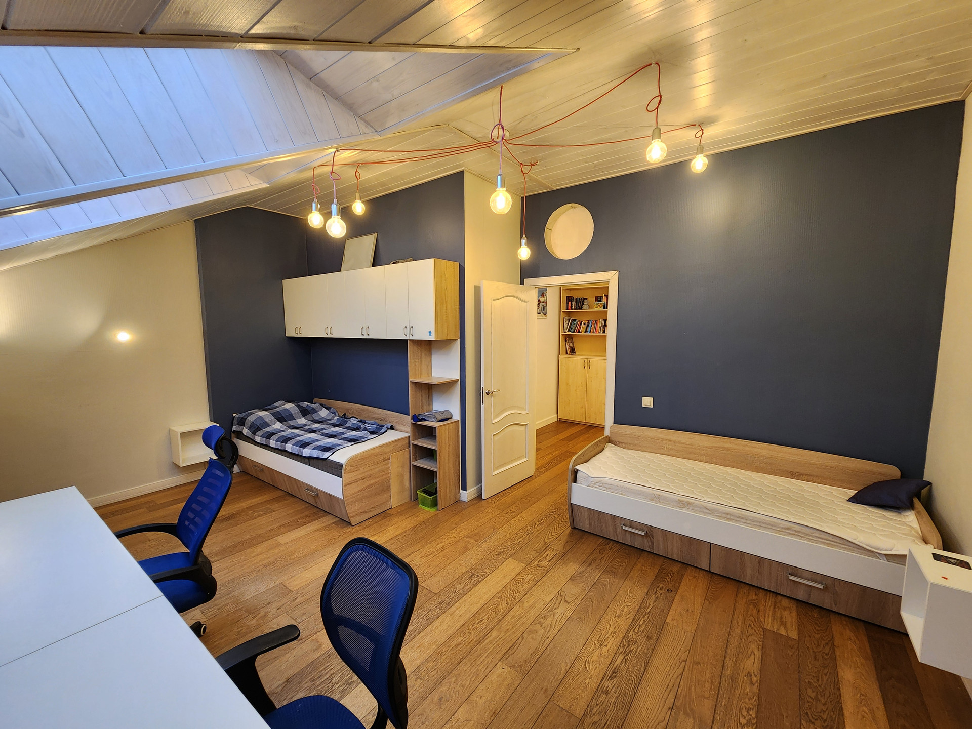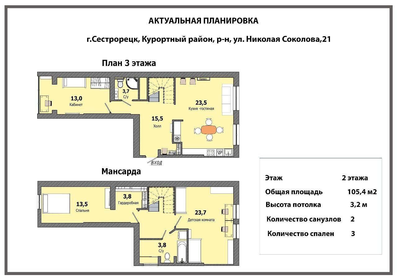 2 этаж- спальня 13,5 кв.м. и детская комната 23,7 кв.м. с мансардными окнами, гардеробная комната 3,8кв.м. и ванная комната 3,8 кв.м.