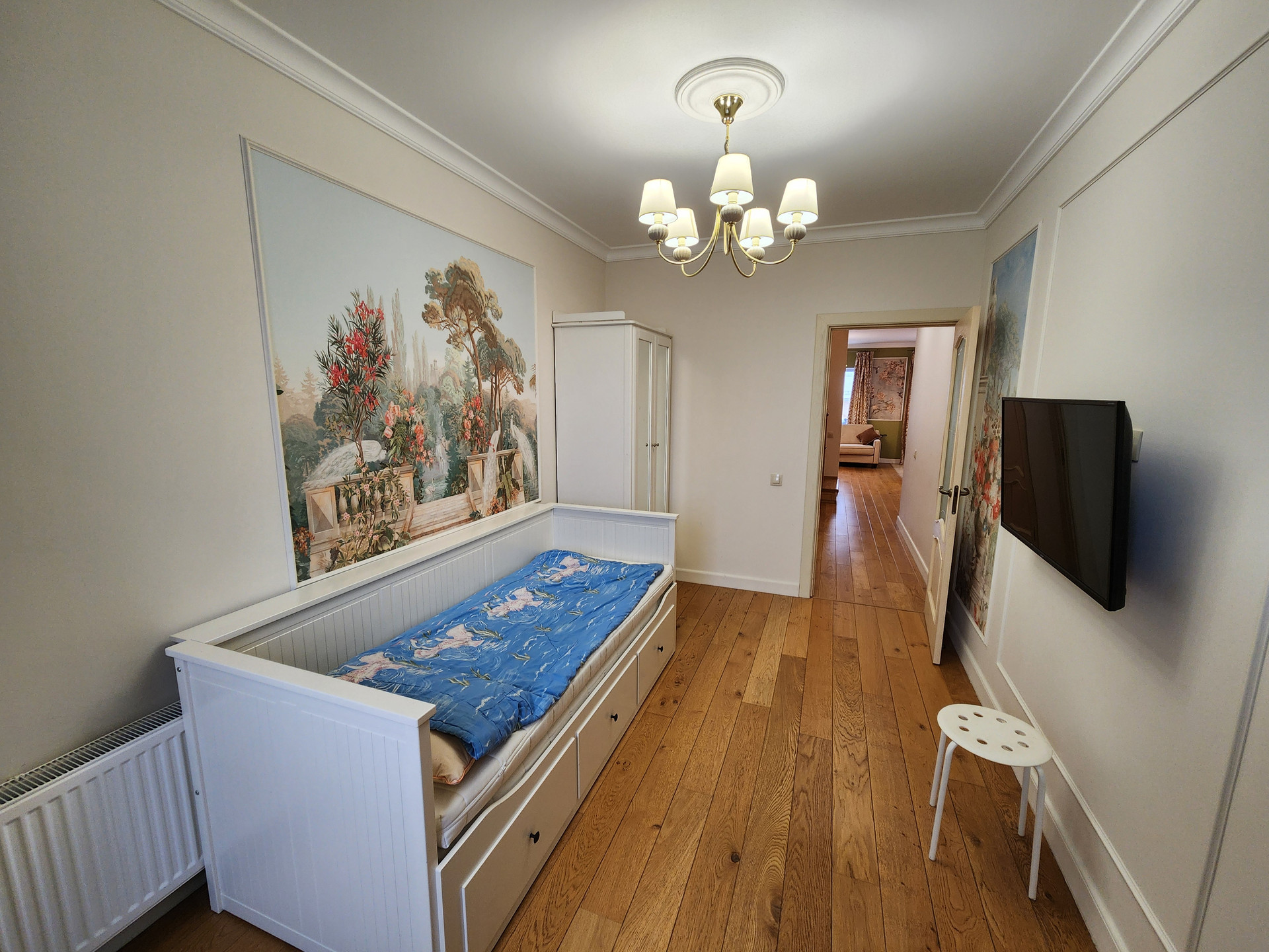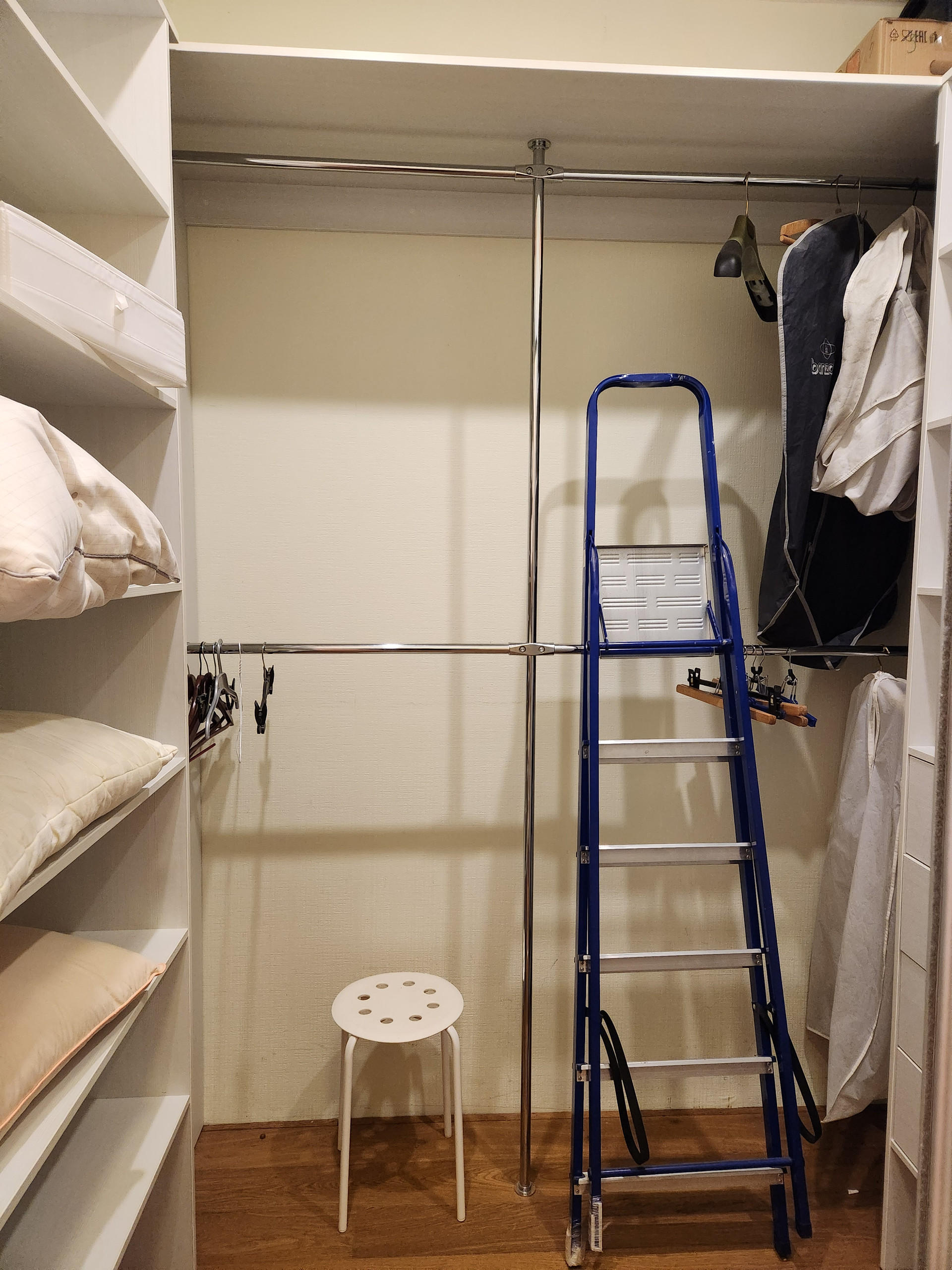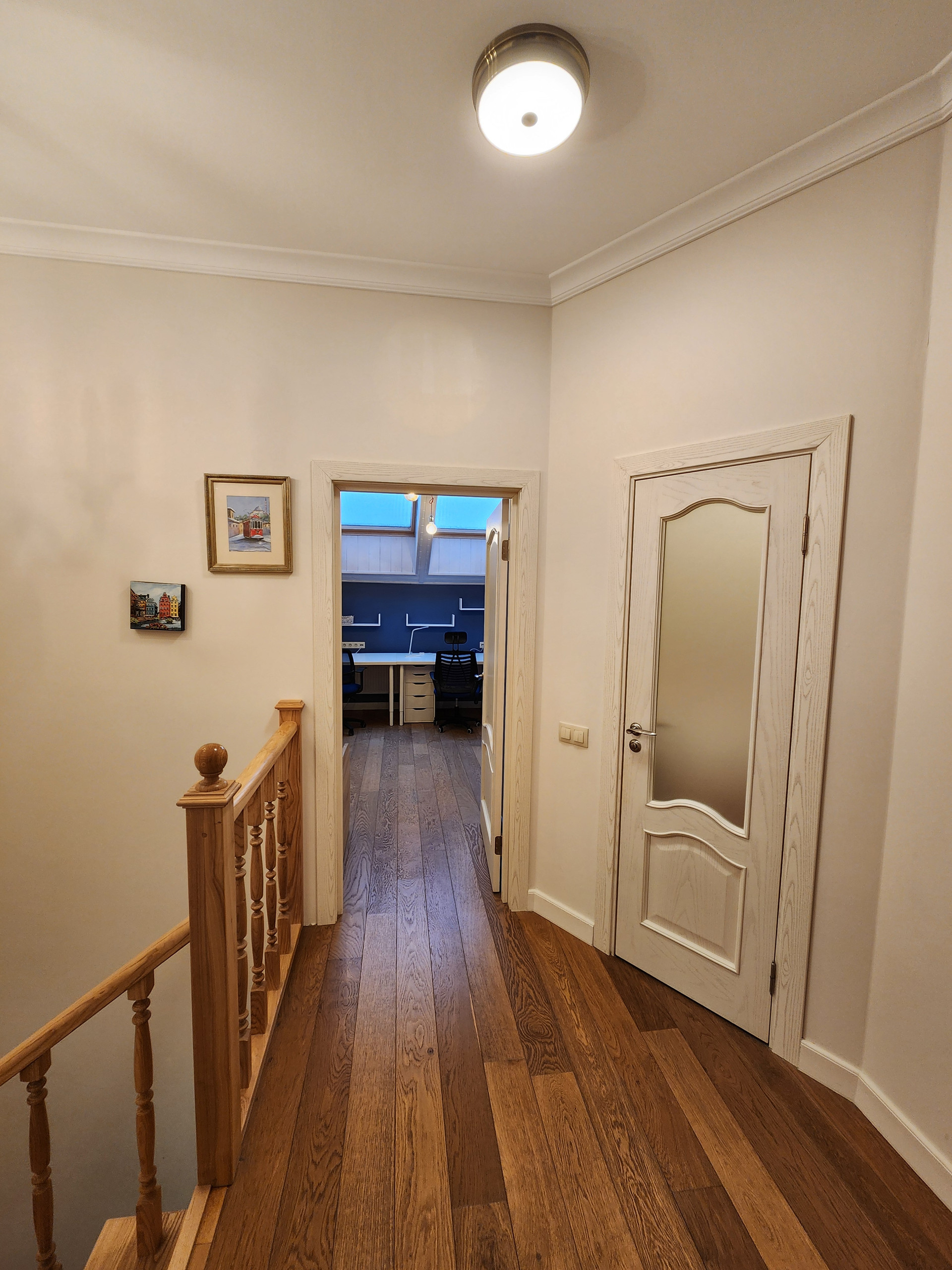 Лестница выполнена из ясеня c удобным размером шага. Под лестницей кладовое помещение.