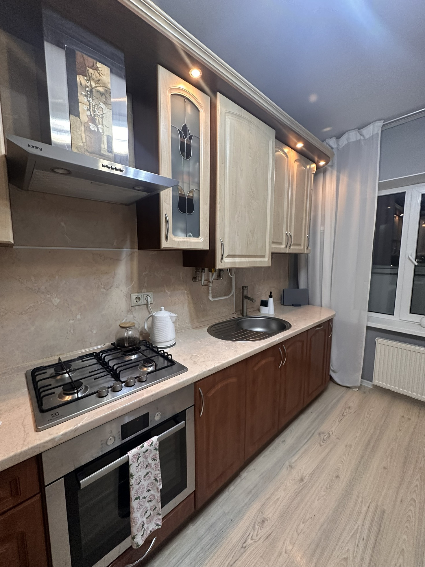 Функциональная кухня (10.2 м2) , полностью оснащенная всей необходимой мебелью и техникой. Установлен газовый котёл, за счет чего Вы сами регулируете тепло в квартире и не зависите от сезонного отопления. Так же это влияет на стоимость коммунальных платежей. В зимний период около 5000 рублей, в летнее время - 3000 рублей.