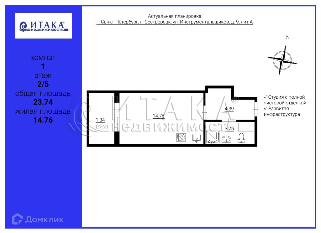 1-комнатная квартира, 23.74 м2, этаж 2 / 5, на продажу в Сестрорецке, улица Инструментальщиков, 9