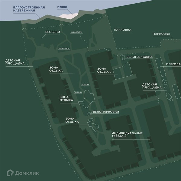 Территория будет благоустроена в традициях европейских загородных объектов. Концепция разработана студией ландшафтного дизайна. Закрытая территория, вход только для жителей. Собственная благоустроенная набережная, променад «Зеленый берег» с арт-объектами, велодорожки и велопарковками, места для занятия спортом и йогой, закрытый бассейн только для жителей комплекса с террасой для загара.