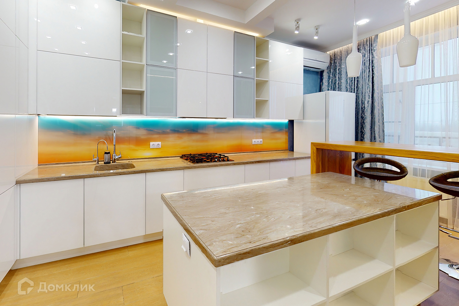 •    Просторная кухня - гостиная 36 кв.м. с зоной готовки, обеденной зоной с электрическим камином и увлажнителем воздуха и выходом на балкон.