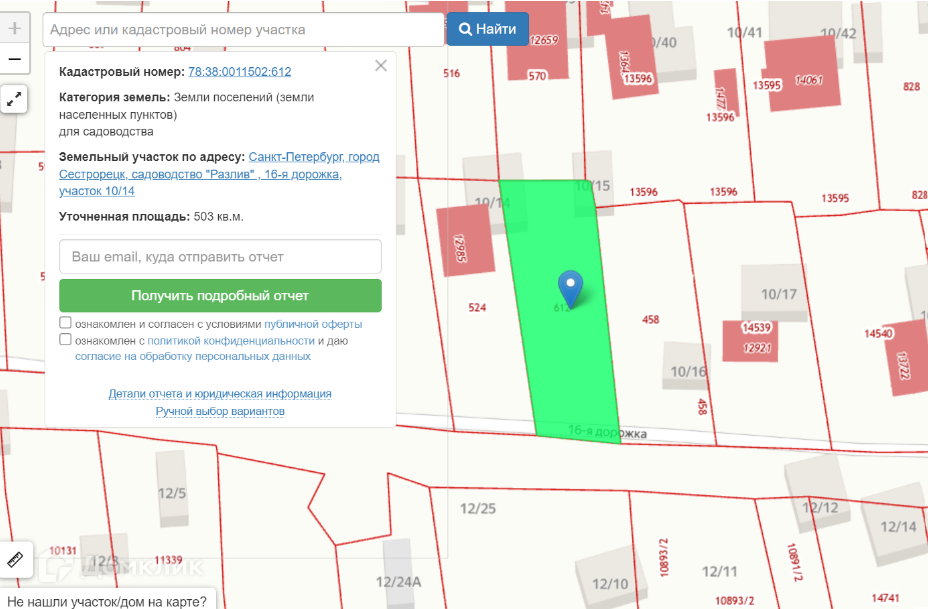 Земельный участок по адресу: Санкт-Петербург, город Сестрорецк, садоводство "Разлив" , 16-я дорожка, участок 10/14