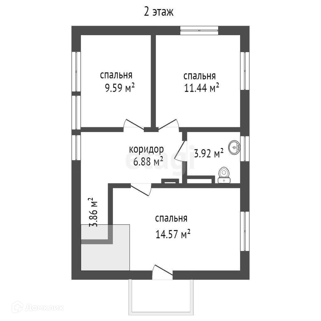 второй этаж - спальная комната с выходом на балкон - 14,6 кв.м. и две раздельные спальные комнаты - 11,4 и 9,6 кв.м., сан.узел - 3,9 кв.м., коридор - 6,8 кв.м.