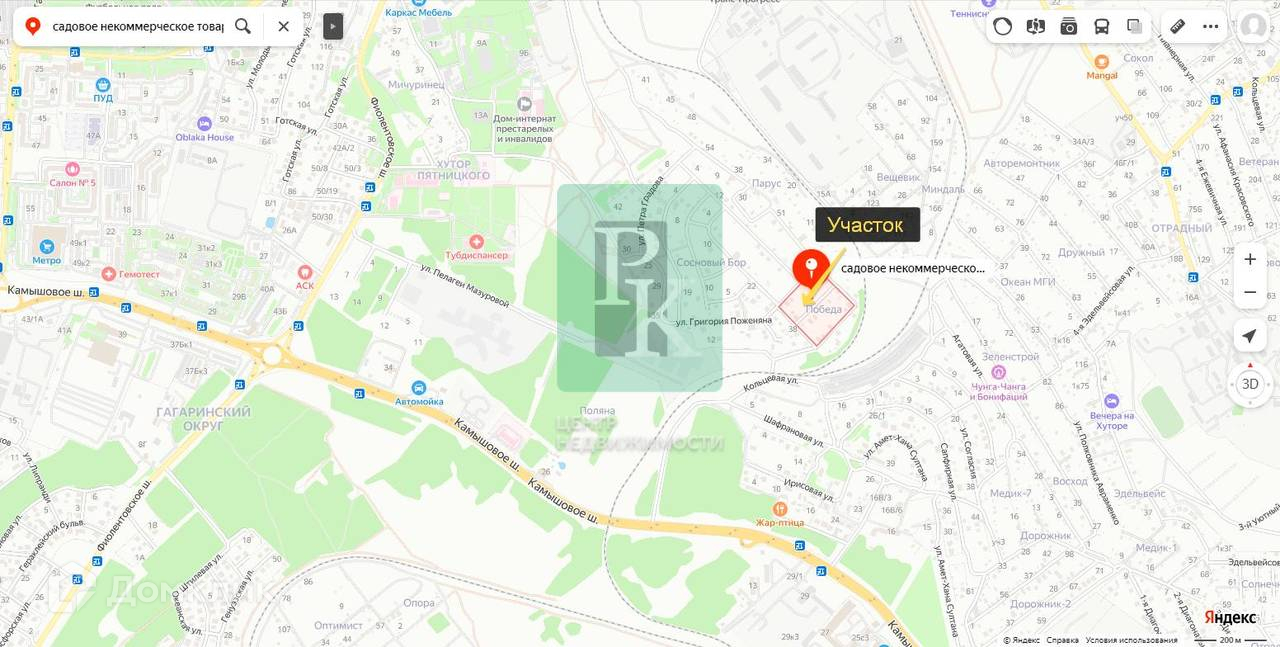 Дом 36,4 м² на участке 4,6 сотки, одноэтажный. Расположен в г. Севастополь, Гагаринский район, СНТ “Победа”. Коммуникации: электричество, водоснабжение, канализация.