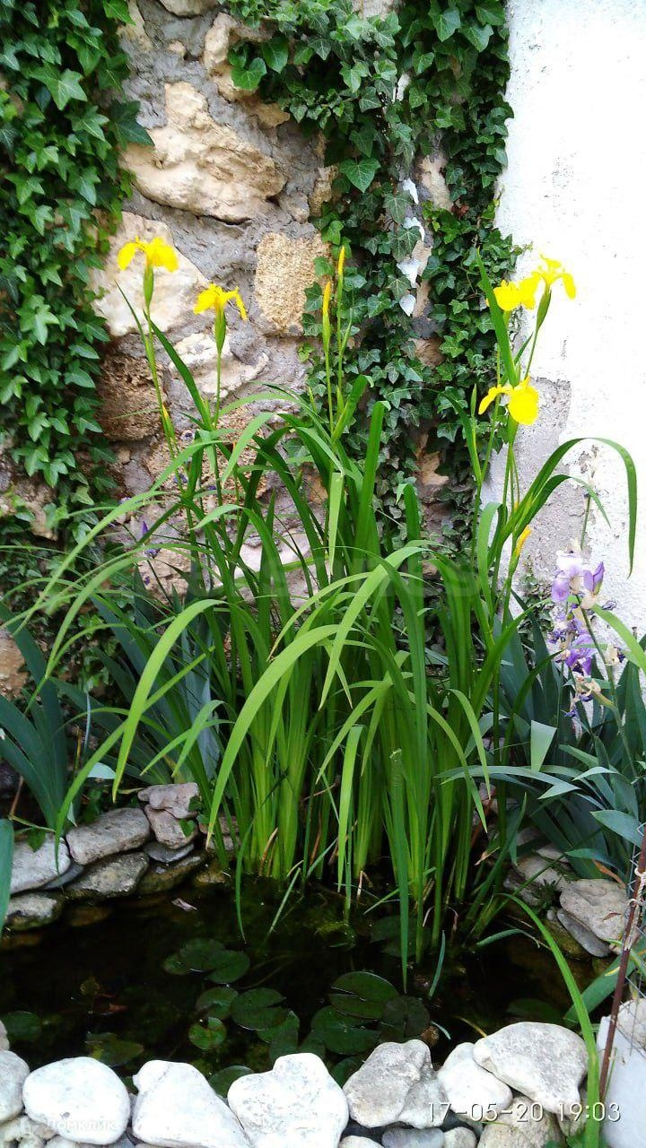 Территория двора в плитке,  два пруда с водяными ирисами, лилиями, рыбками, розы, много цветов.