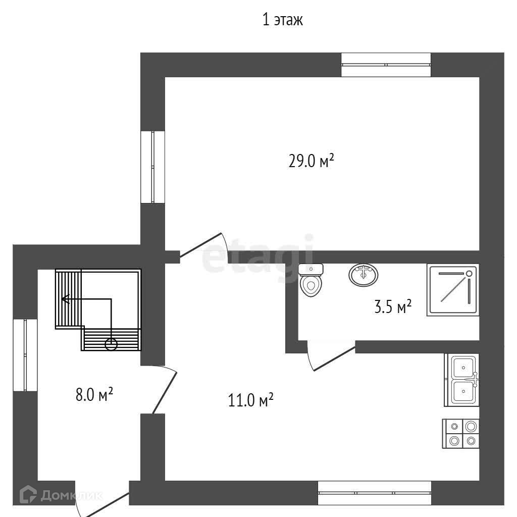 На первом этаже коридор 8 м2, кухня 11 м2, жилая комната 20 м2 и с/у 3,5м2 ( без отделки, НО все трубы выведены).