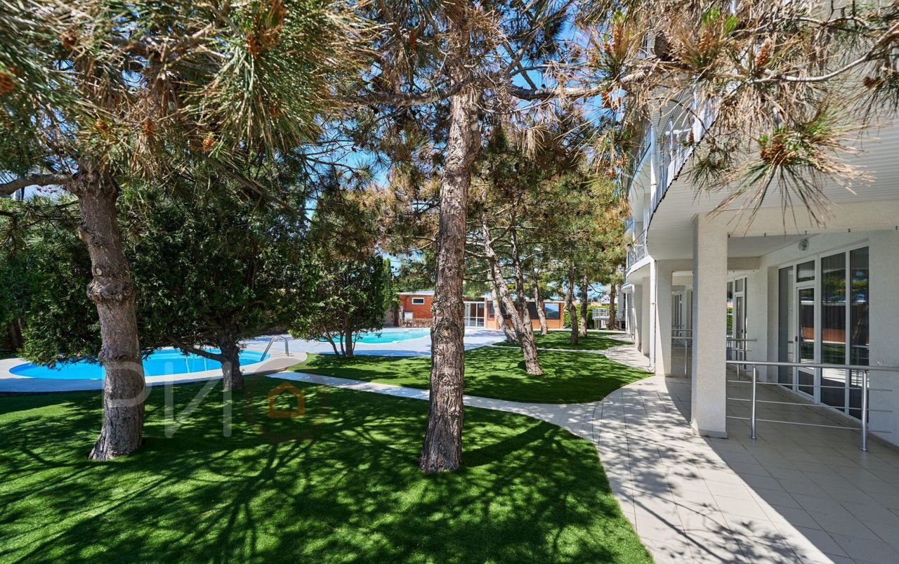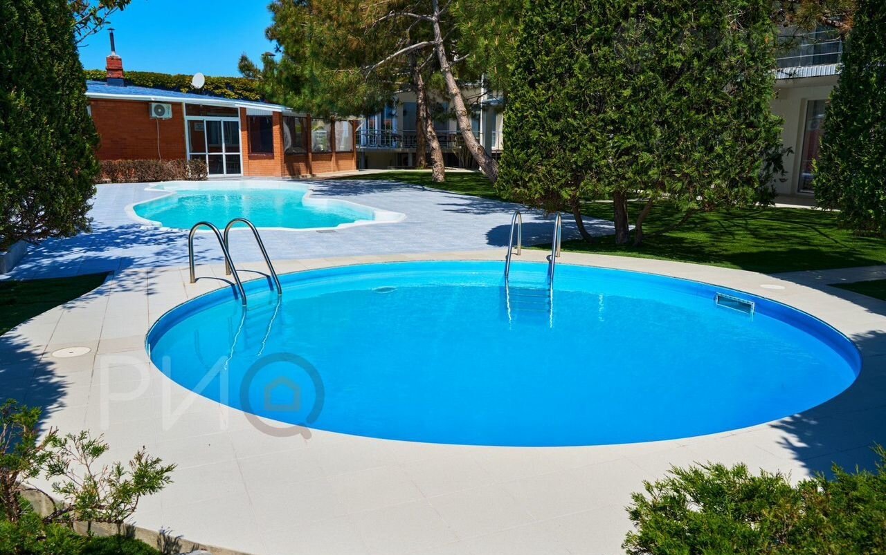 Участок: Большой благоустроенный двор с зелёными зонами, бассейнами и зоной отдыха.