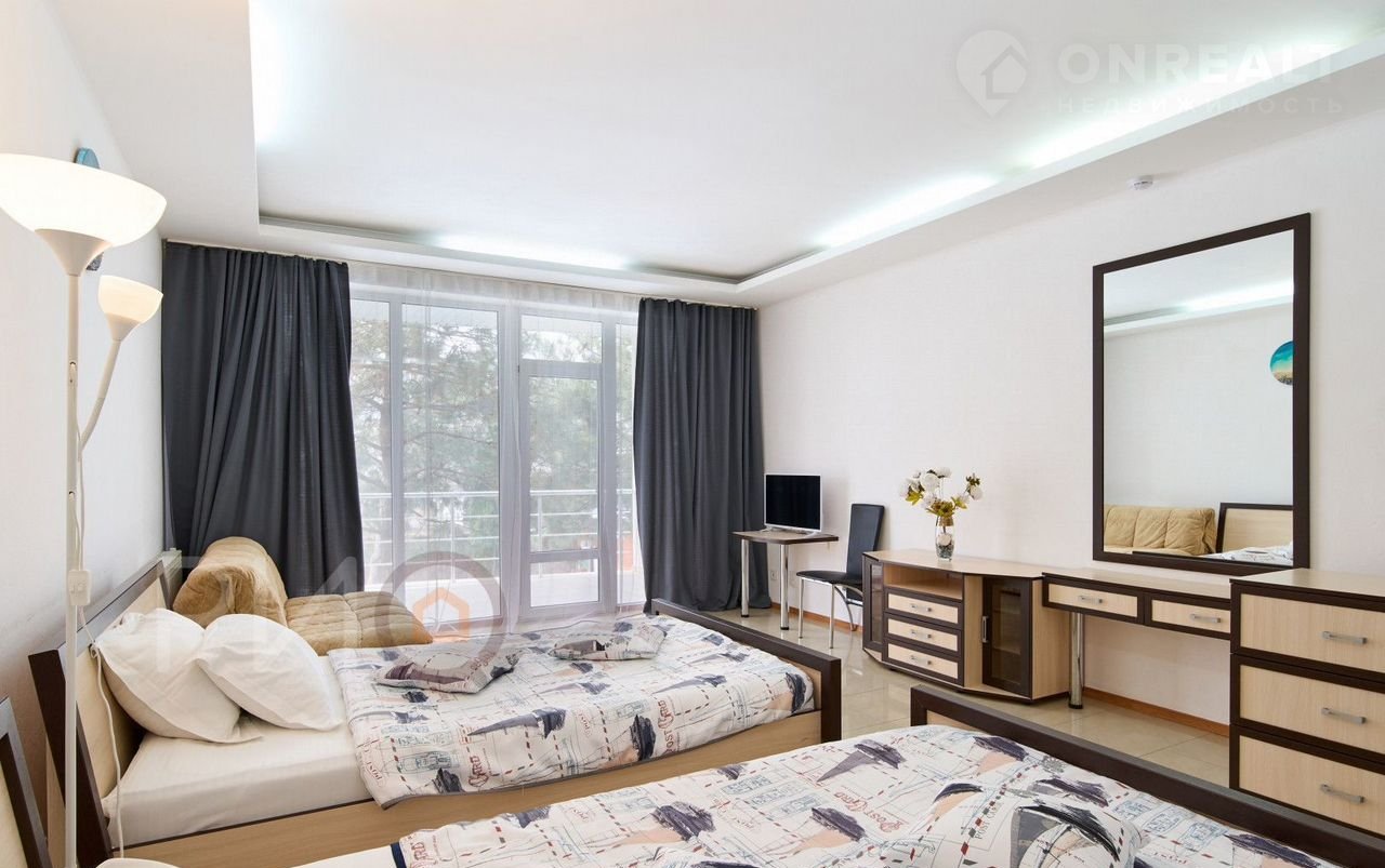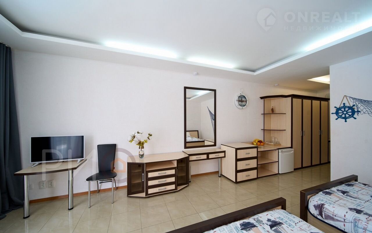 Полное оснащение для комфортного проживания: спальные места, шкафы, телевизор, стильная мебель.