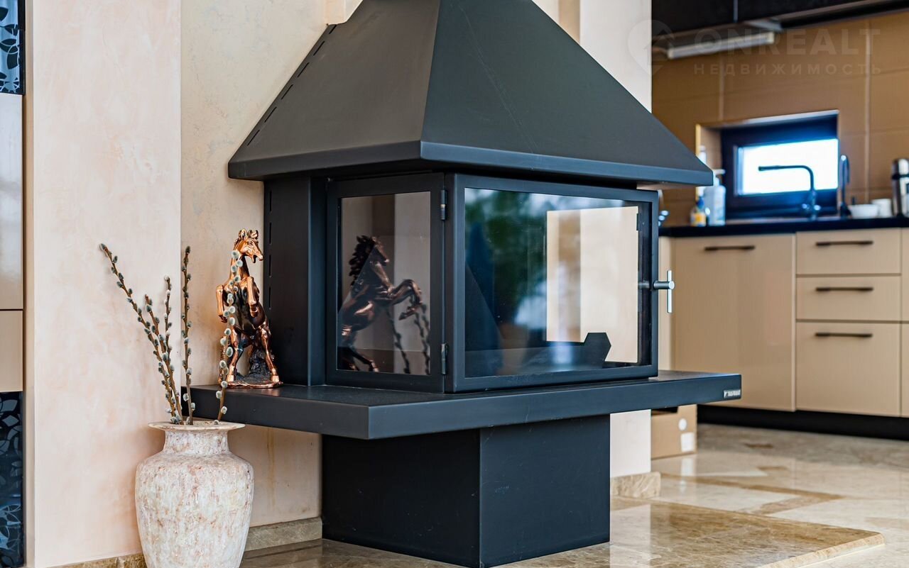 - На втором этаже находится кухня-гостиная с камином.