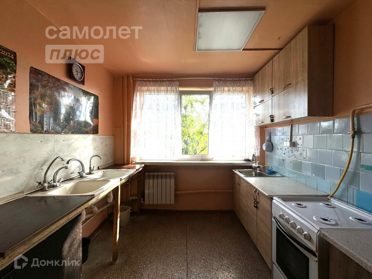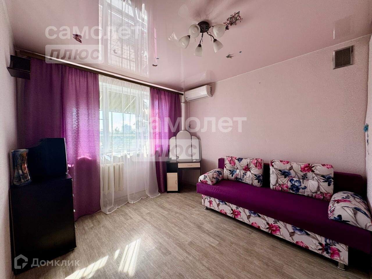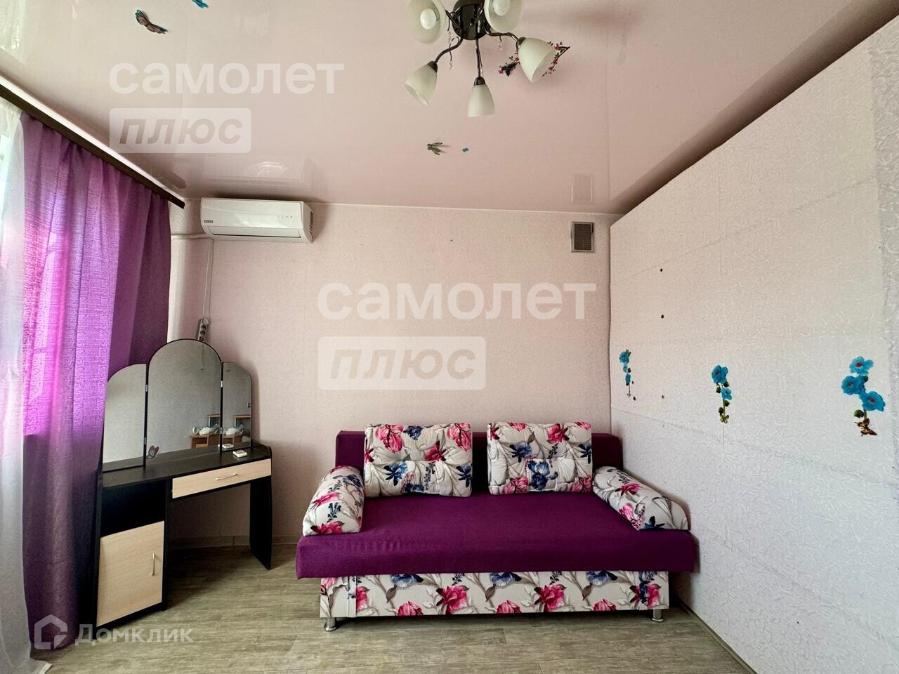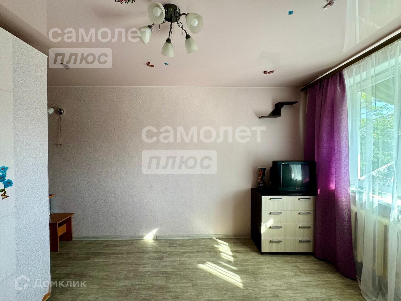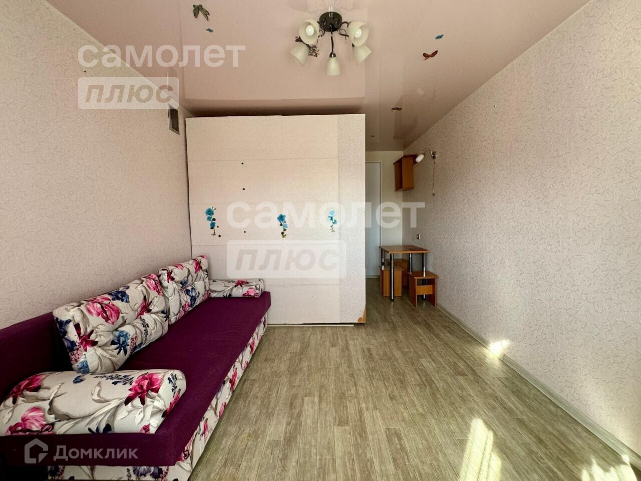 В комнате выполнен хороший ремонт: поклеены обои, установлены натяжной потолок, металлопластиковые окна, постелен линолеум. Из мебели остаётся всё: большой шкаф купе, новый раскладной диван, полки, письменный и кухонный столы, стулья, зеркало с полочками.
